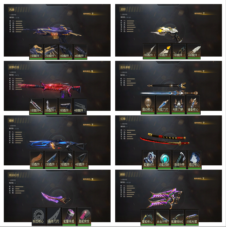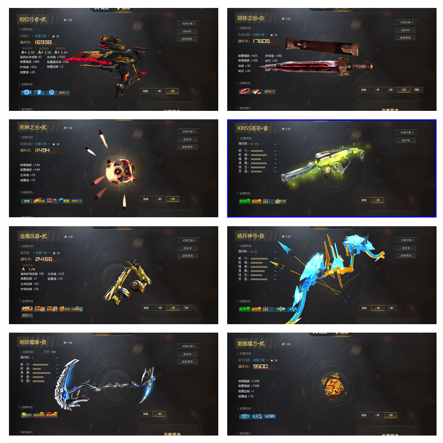 其它武器:【满配幻锋+月华皮肤】【满配含光承影】【满配瞬影+皮肤】【数据魔方-贰】【满配镭射】【12配裂星】【34配戏法幻刃】【双持加特林贰】【123配狂暴之握】【汉剑3阶】【急冻双星】【相位行者-贰】【寄生者-白板】【深渊之刃-贰】【死神之光-贰】【金属风暴-贰】【皓月神弓-壹】【黄金战盾】【炎魔灭世-贰】