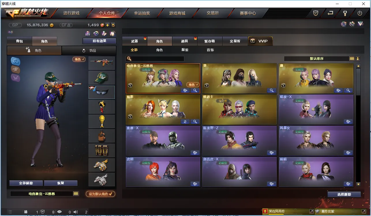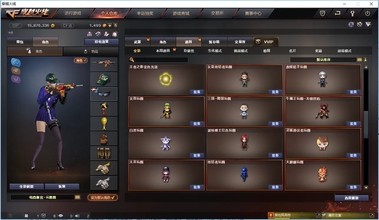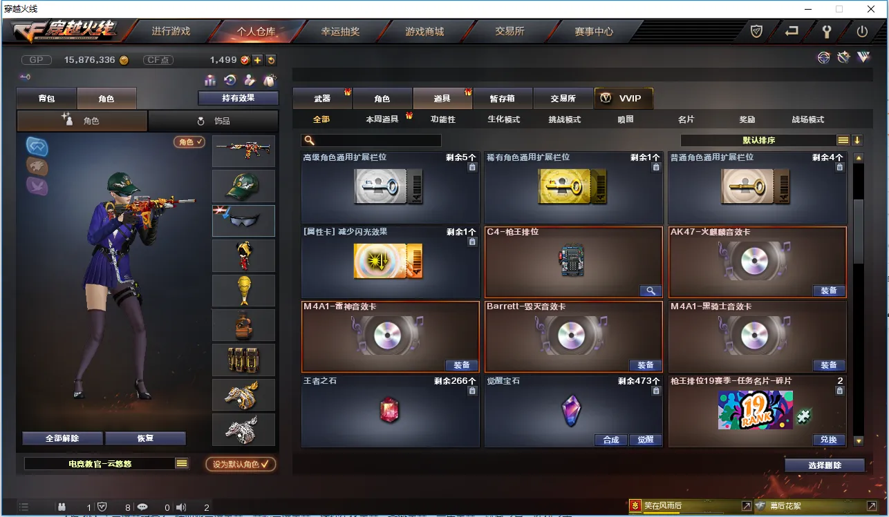 【角 色】:CFVIP4、元首等级、电竞教官云悠悠、沙漠玫瑰、葵、鹰、魅影、修道士、王者零-传说之路、救世主X、新猎狐者、幻影、堕天使、邓紫棋、救世主、潜龙队、兰、深海之兰、夜玫瑰、威锋、烟雾保护头盔、闪光护目镜、超级对讲机、BS战队炫彩背包、超级背包、炫彩背包、双龙戒指、双蛇戒指、8周年戒指