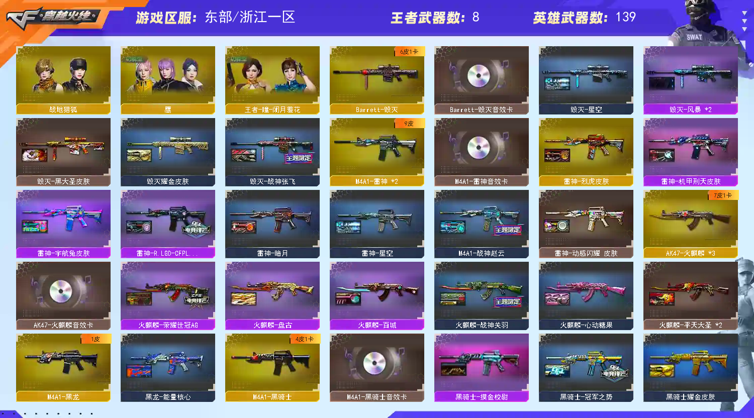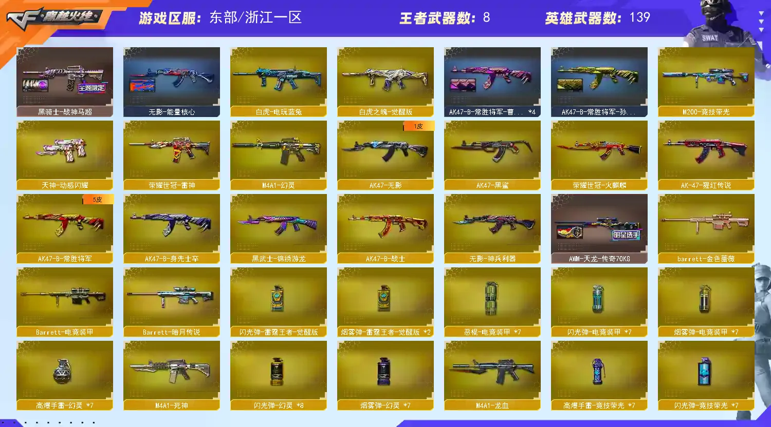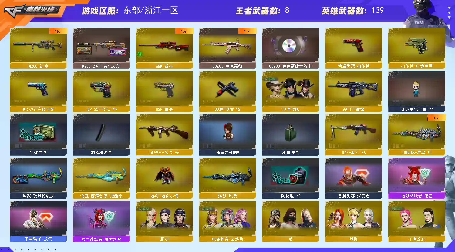 【主 武】:M200竞技荣光、6烈龙斯泰尔炼狱、6盘龙加特林炼狱、炼狱小刚、王者之幻、炫金骑士、炫金毁灭、炫金天龙、悦蓝-惊涛骇浪、火麒麟(AG皮肤、荣耀世冠AG)、黑龙、雷神X2、黑骑士X2、无影、死神、黑鲨、龙血、QBZ03-金色蔷薇、烈火、猩红传说、AK47-B-战神、黑武士-CF网剧冠军套装、黑骑士-海王、AK47-B-身先士卒、AK47-常胜、毁灭、极光、裁决、Barrett朱雀、雪莉杨-裁决、Barrett金色蔷薇、Barrett-暗月传说、盘龙X6、加特林炼狱X2、烈龙X6、斯泰尔蝴蝶、AA12雷霆、荣耀世冠火麒麟、荣耀世冠-雷神、极光毁灭者、神圣爆裂者、神罚、苍雷、乱世、末日毁灭者、冰龙粉碎者-白马银枪、试炼破坏者、机甲撕裂者、金魔等各种活动武器