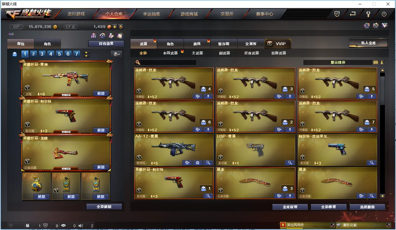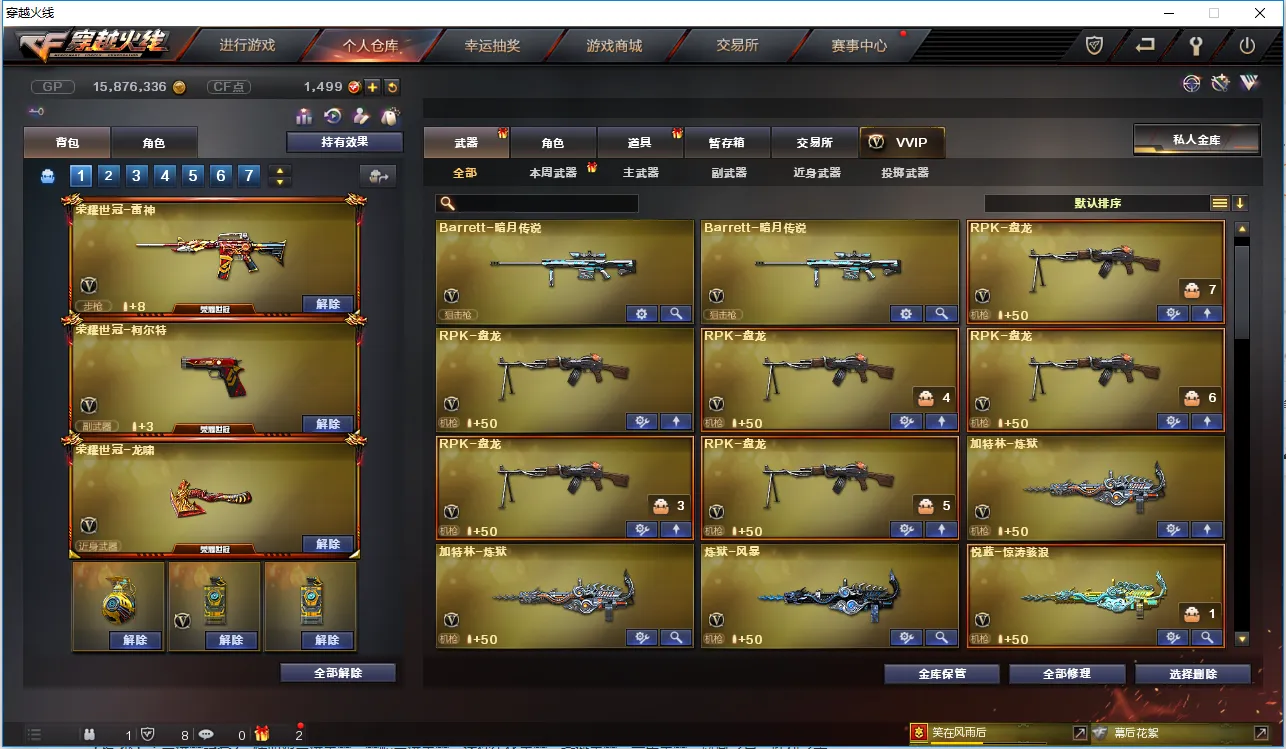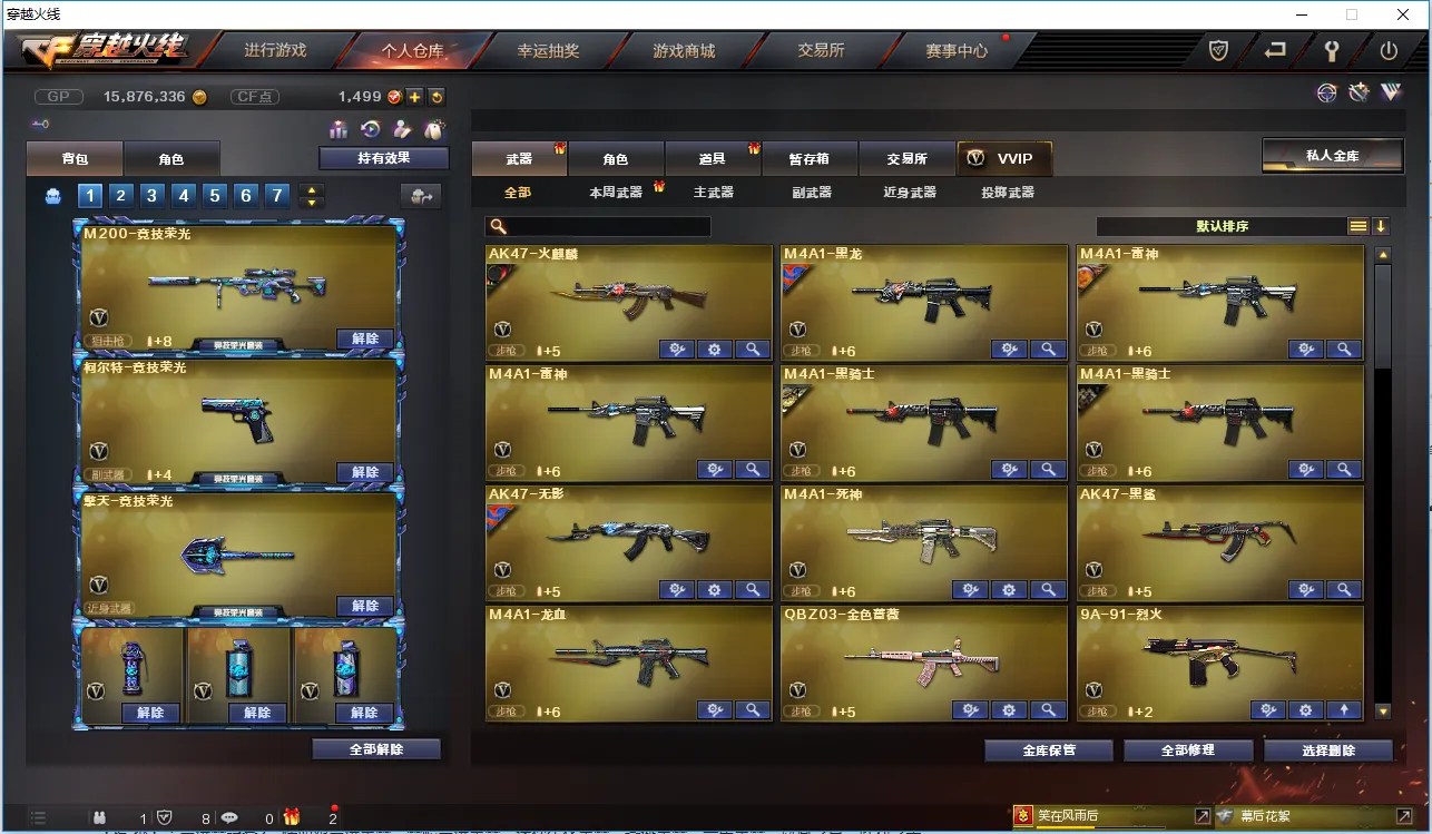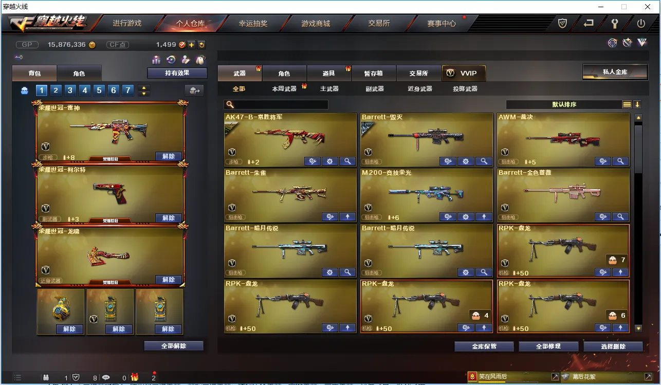 【主 武】:M200竞技荣光、6烈龙斯泰尔炼狱、6盘龙加特林炼狱、炼狱小刚、王者之幻、炫金骑士、炫金毁灭、炫金天龙、悦蓝-惊涛骇浪、火麒麟(AG皮肤、荣耀世冠AG)、黑龙、雷神X2、黑骑士X2、无影、死神、黑鲨、龙血、QBZ03-金色蔷薇、烈火、猩红传说、AK47-B-战神、黑武士-CF网剧冠军套装、黑骑士-海王、AK47-B-身先士卒、AK47-常胜、毁灭、极光、裁决、Barrett朱雀、雪莉杨-裁决、Barrett金色蔷薇、Barrett-暗月传说、盘龙X6、加特林炼狱X2、烈龙X6、斯泰尔蝴蝶、AA12雷霆、荣耀世冠火麒麟、荣耀世冠-雷神、极光毁灭者、神圣爆裂者、神罚、苍雷、乱世、末日毁灭者、冰龙粉碎者-白马银枪、试炼破坏者、机甲撕裂者、金魔等各种活动武器