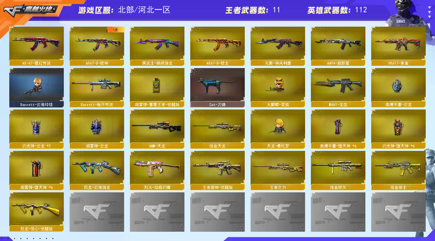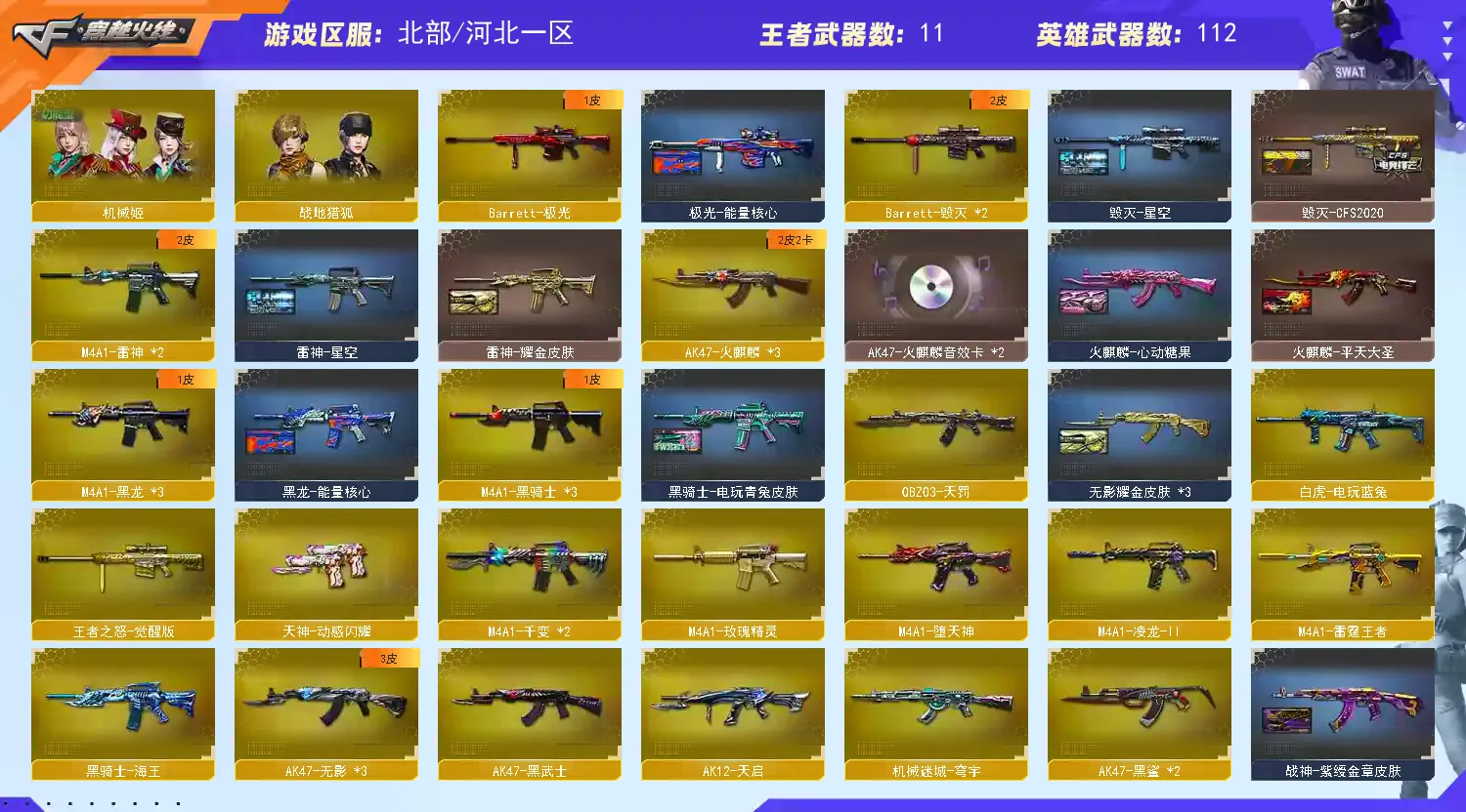 本游戏账号:英雄武器86个; 王者武器48个。 装备不多,但是主武器、副武器、近身武器够用 拥有完美游戏体验。重要的是,特殊装备有:M4A1-玫瑰精灵、AK47-火麒麟、加特林-炼狱、龙啸-堕天神、HK417-朱雀、黑骑士-海王、炫金毁灭、王者之力、炫金天龙、炫金骑士、源·火麒麟、源·黑骑士、火麒麟-灵狐、炼狱-悦蓝-觉醒版、王者之怒-觉醒版、王者-零、魅影、迷迭香、王者-葵-貂蝉、生化弹匣、堕天使道具卡、炼狱-悦蓝金色光效、等,随意畅选。
