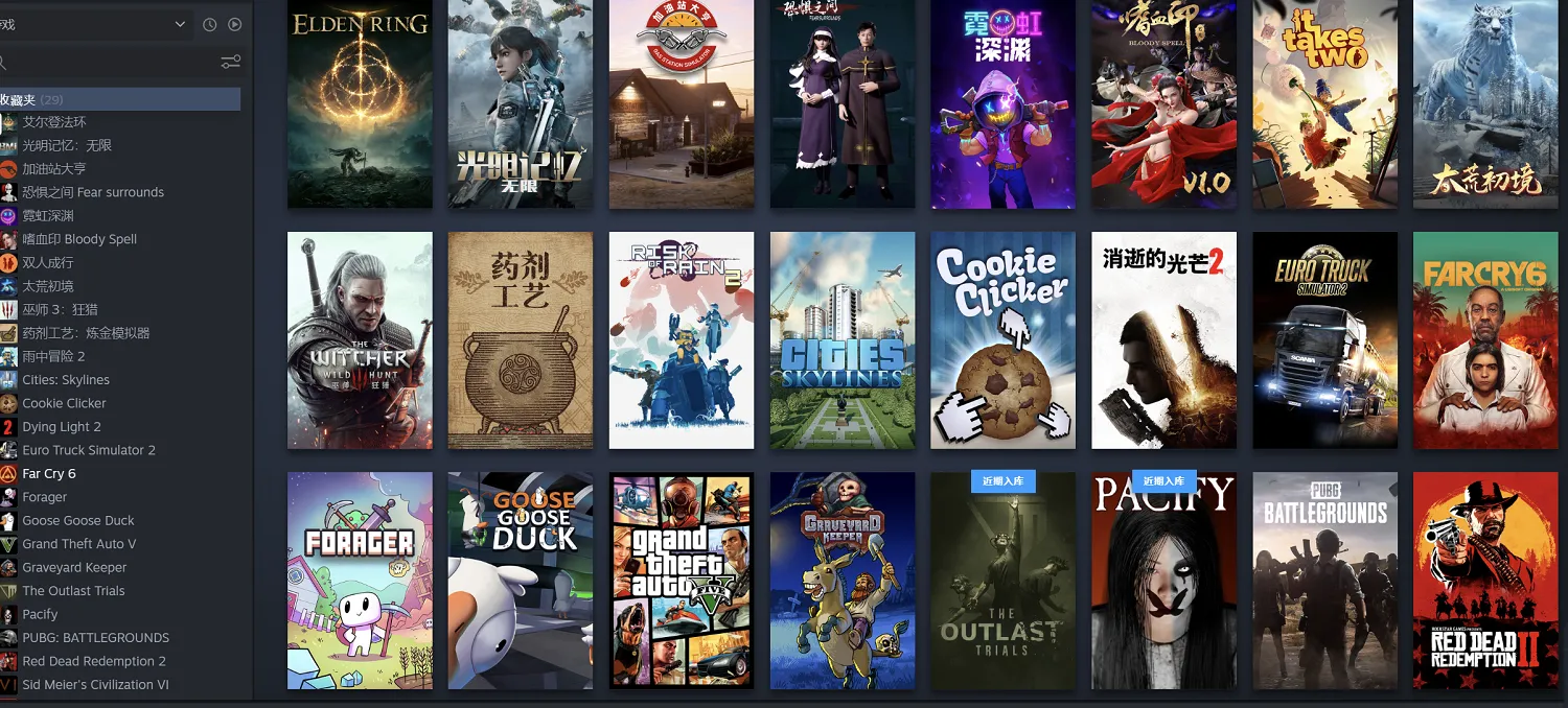 逃生试炼(The Outlast Trials)、孤岛惊魂6标版/远哭6(Far Cry 6 Standard Edition)、森林之子/迷失森林2(Sons Of The Forest)、太荒初境、艾尔登法环、消逝的光芒2人与仁之战(Dying Light 2 Stay Human)、荒野大镖客2(Red Dead Redemption 2)、超级兔子人 super bunny man、守墓人 Graveyard Keeper、城市天际线/都市天际线 Cities: Skylines、星露谷物语 Stardew Valley、嗜血印 Bloody Spell、巫师3 、GTA5/侠盗飞车5/侠盗猎车手5、恐惧之间、战锤末日鼠疫2/战锤2末日鼠疫、加油站大亨、避难所2、霓虹深渊种子机器、炼金术师模拟器 、无尽的饼干 Cookie Clicker、《光明记忆无限》黄金版、欧洲卡车模拟2、安抚(Pacify)、文明6(Sid Meier's Civilization VI)