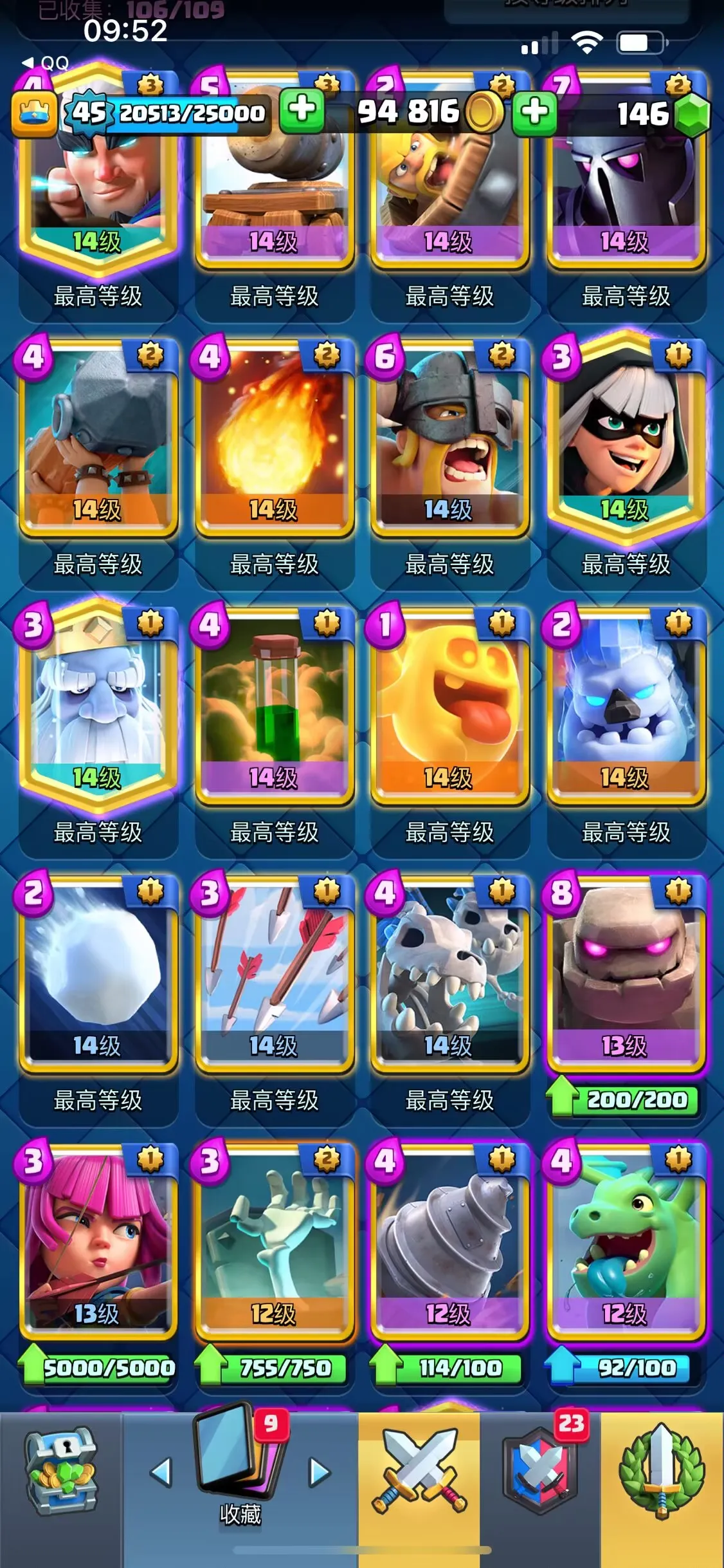 【苹果】 皇室战争,106/109卡 15张满级卡 一级联赛 最高6700杯