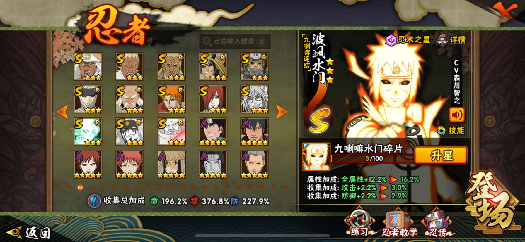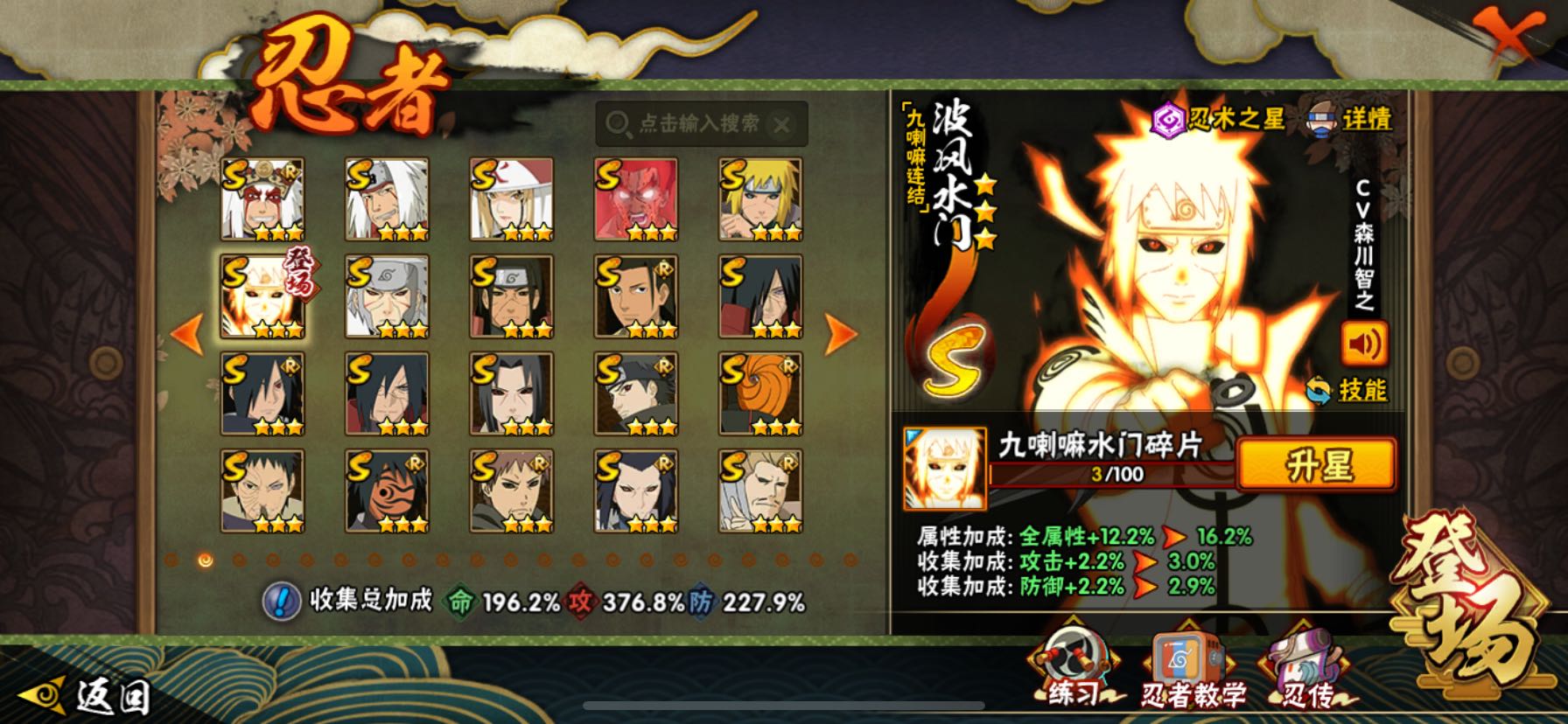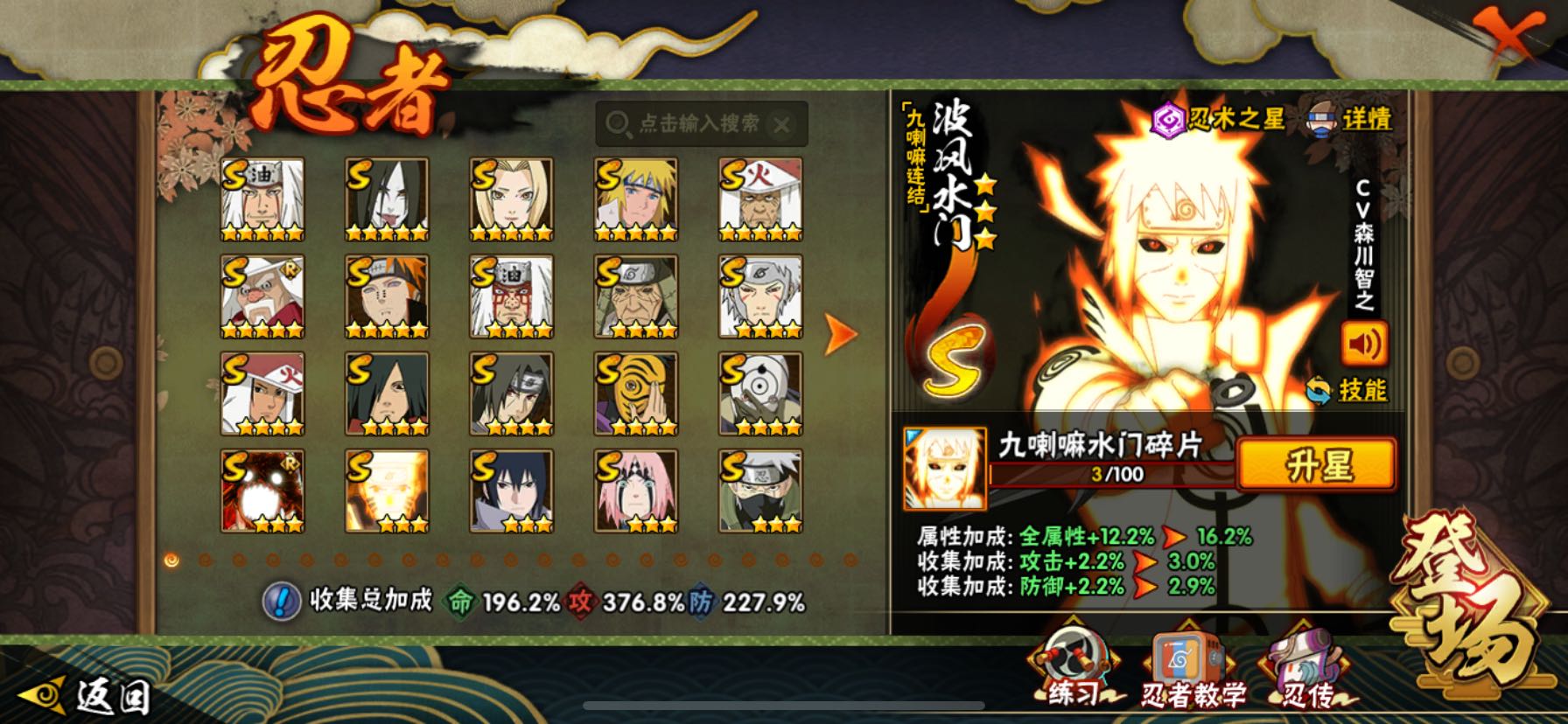 75级魅力值 53S 88A 379忍者 宇智波止水「新春限定」/桃地再不斩「漂泊武士」/佩恩·六道 「漂泊浪客」/波风水门「新春限定」/飞段 「晓创生」/迈特凯「忍界大战」/神秘面具男 「红夜之刃」/宇智波斑 「秽土转生·解」/波风水门「秽土转生」/千手柱间 「木叶创立」/宇智波止水 「须佐能乎」/漩涡鸣人 「九喇嘛连结」/宇智波斑「白面具」/艾 「忍界大战」/宇智波带土「忍界大战」/三代目风影 「秽土转生」/宇智波佐助 「永恒万花筒」/大筒木桃式/佩恩·天道「超」/旗木卡卡西 「须佐能乎」