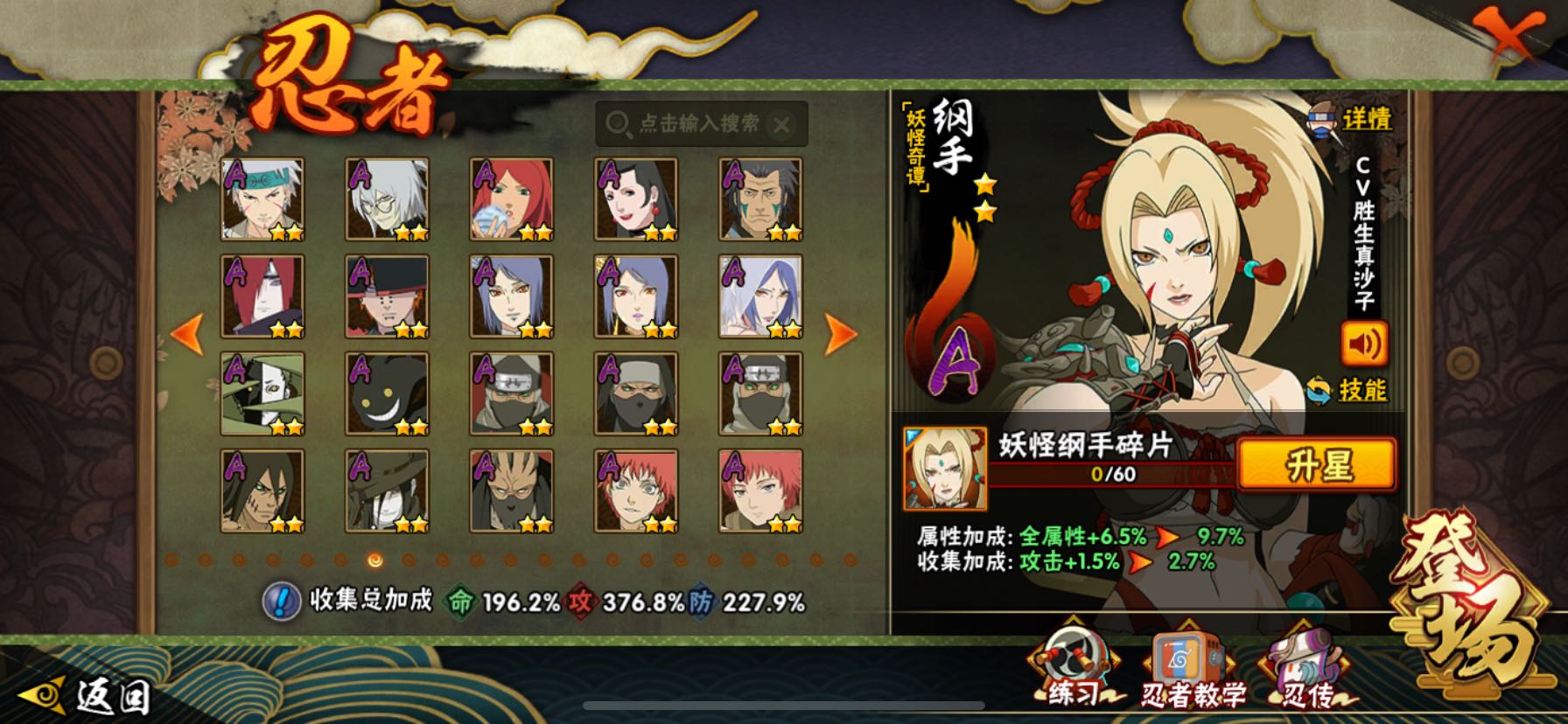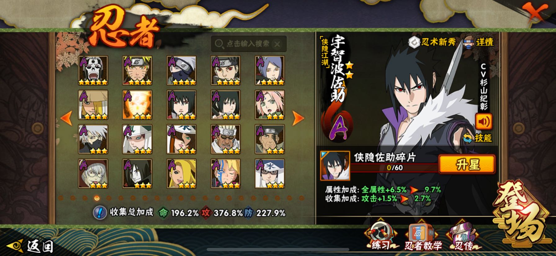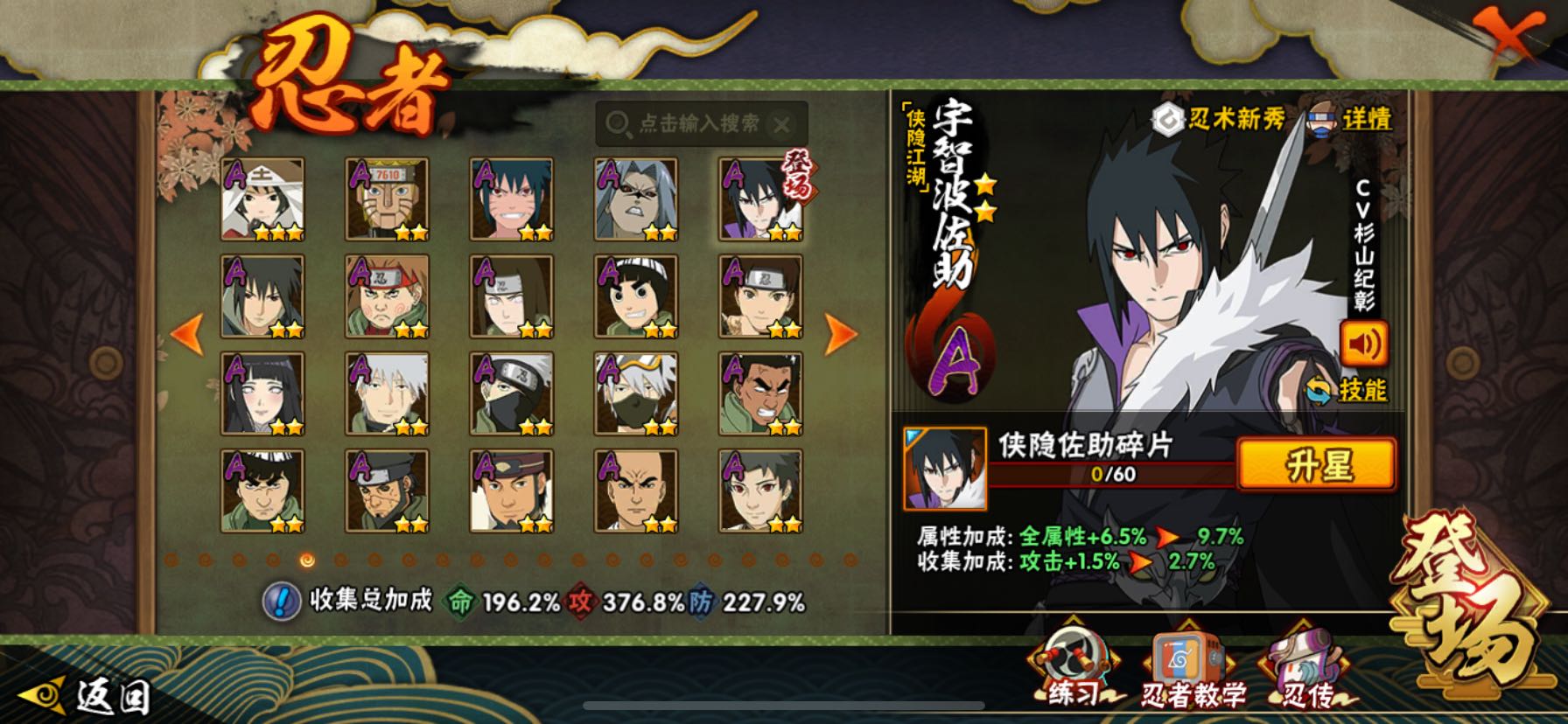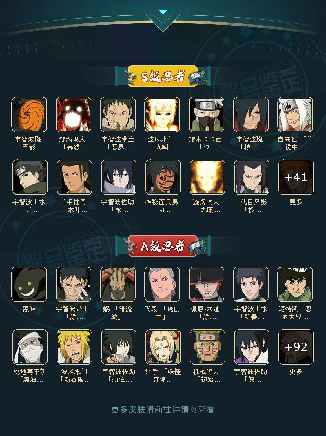 75级魅力值 53S 88A 379忍者 宇智波止水「新春限定」/桃地再不斩「漂泊武士」/佩恩·六道 「漂泊浪客」/波风水门「新春限定」/飞段 「晓创生」/迈特凯「忍界大战」/神秘面具男 「红夜之刃」/宇智波斑 「秽土转生·解」/波风水门「秽土转生」/千手柱间 「木叶创立」/宇智波止水 「须佐能乎」/漩涡鸣人 「九喇嘛连结」/宇智波斑「白面具」/艾 「忍界大战」/宇智波带土「忍界大战」/三代目风影 「秽土转生」/宇智波佐助 「永恒万花筒」/大筒木桃式/佩恩·天道「超」/旗木卡卡西 「须佐能乎」