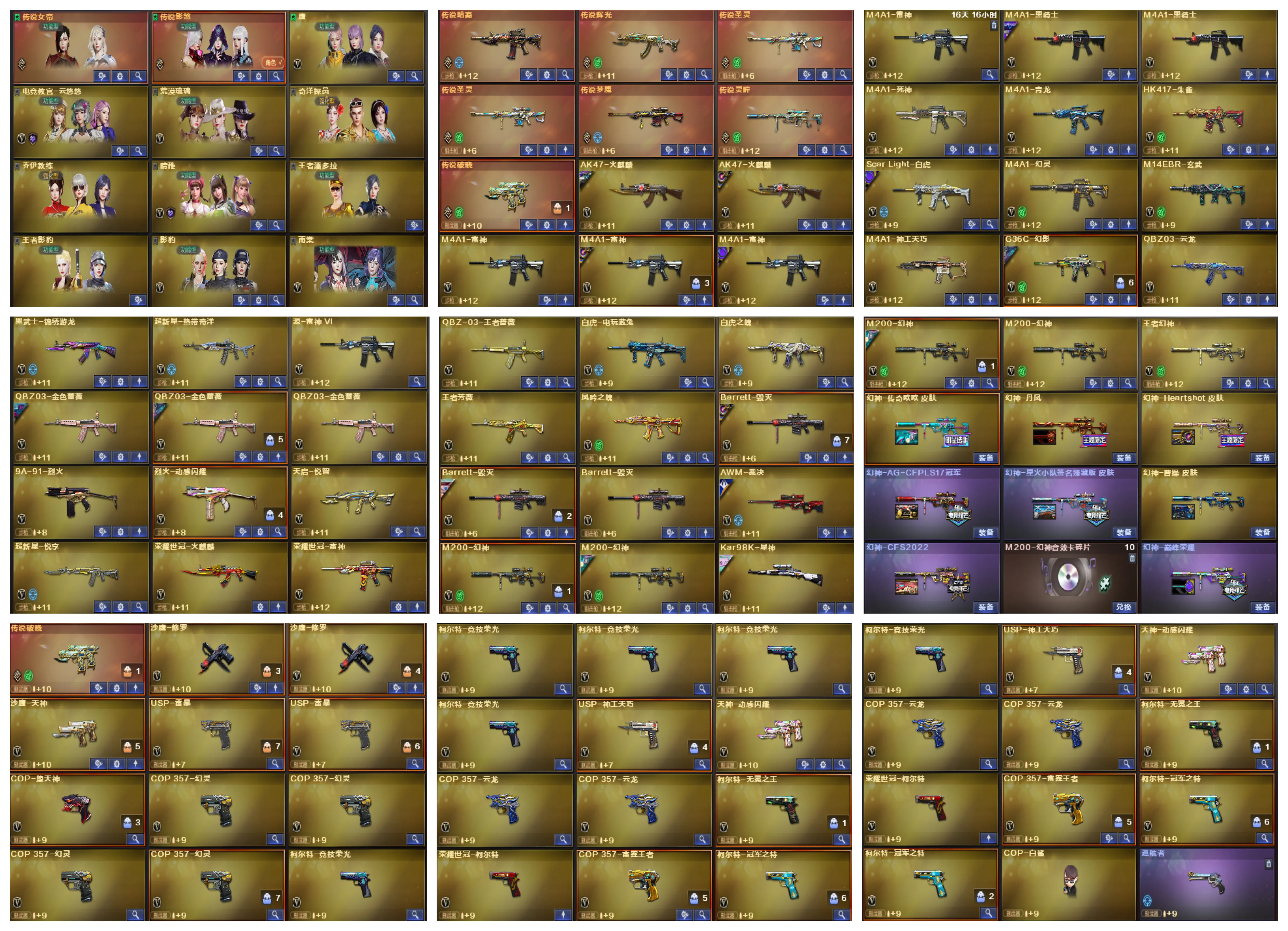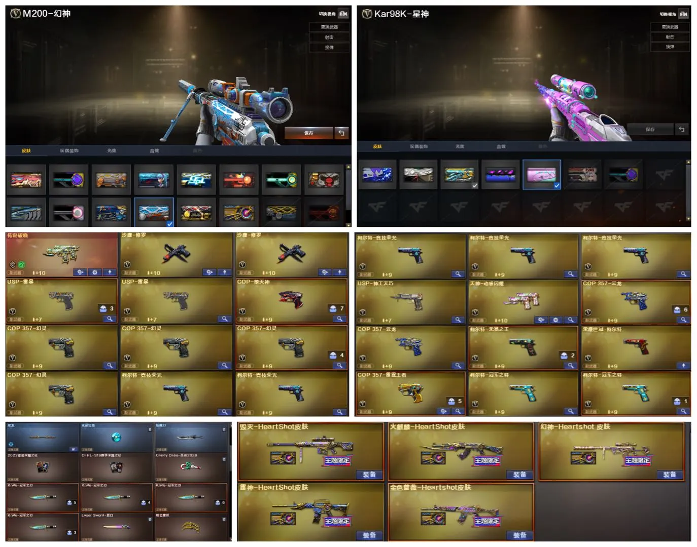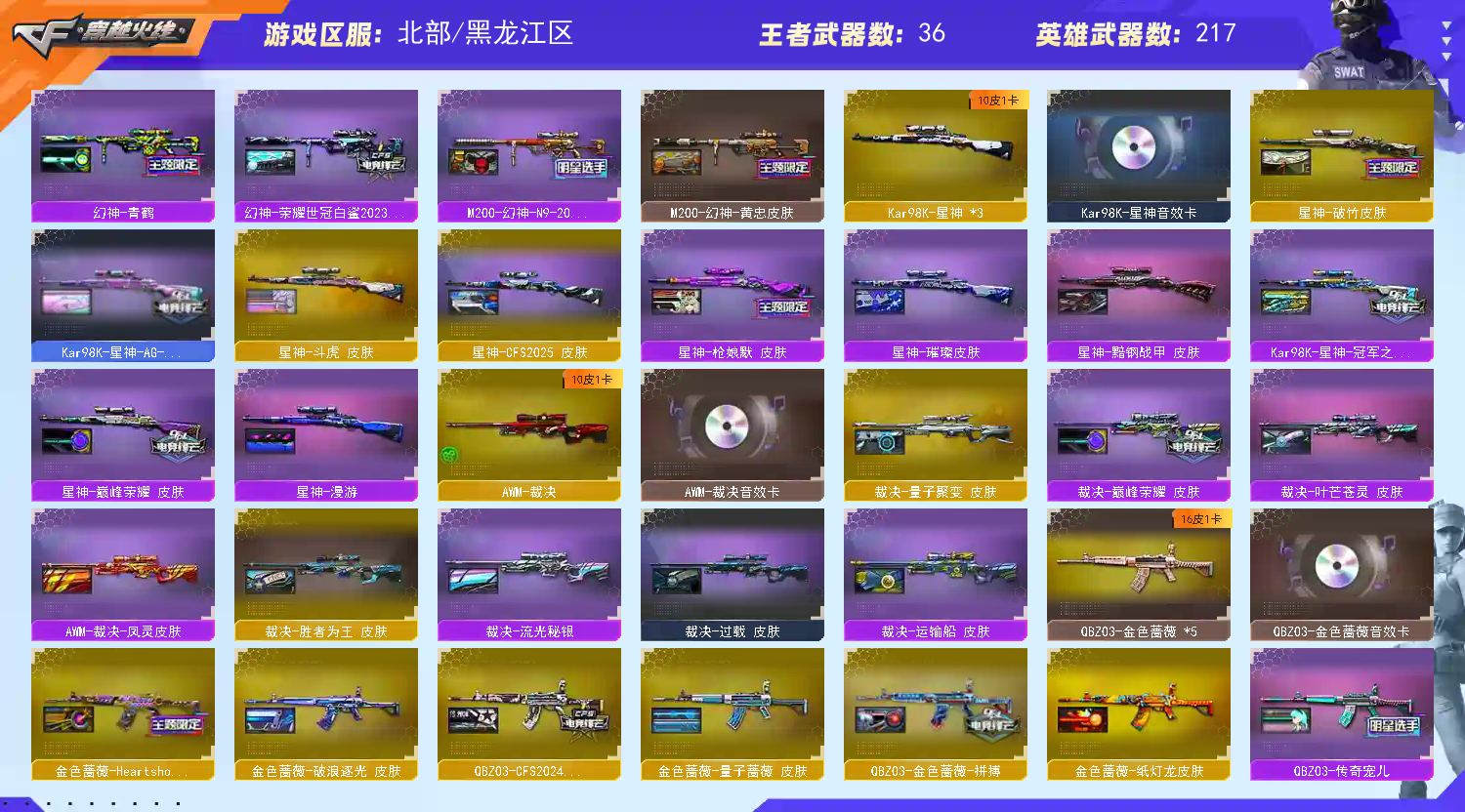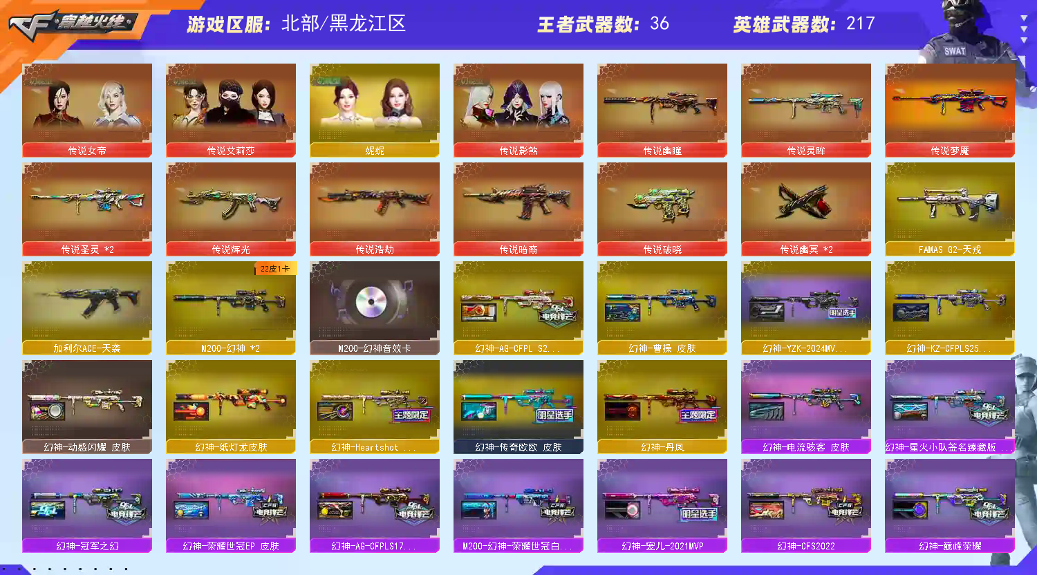 稀有武器:王者风神、传说辉光、传说暗裔、传说圣灵、白虎(AG皮肤)、玄武、星神、双幻神(CFS2022、巅峰荣耀、黄忠)+音效卡、M200-竞技荣光 、白虎之魄