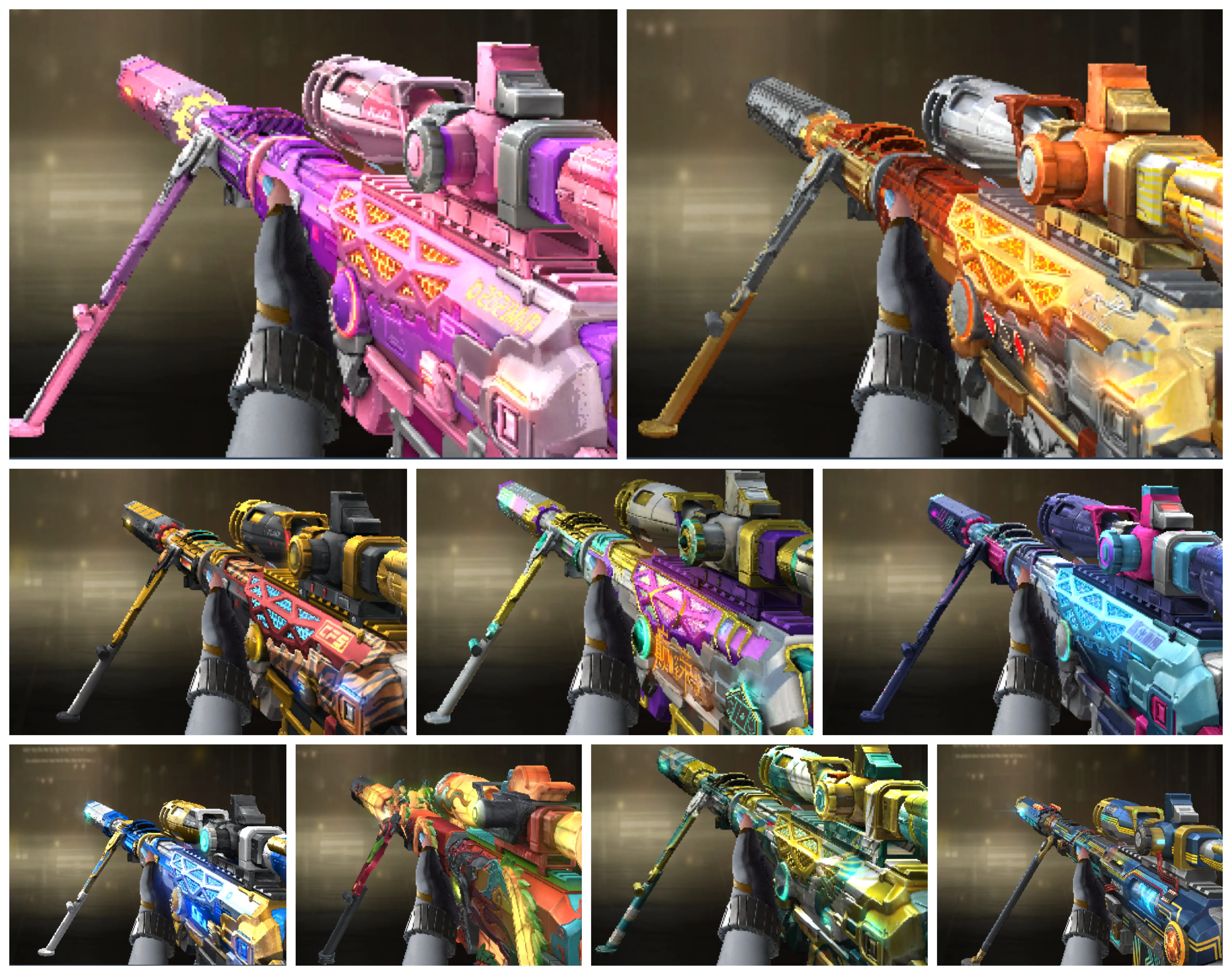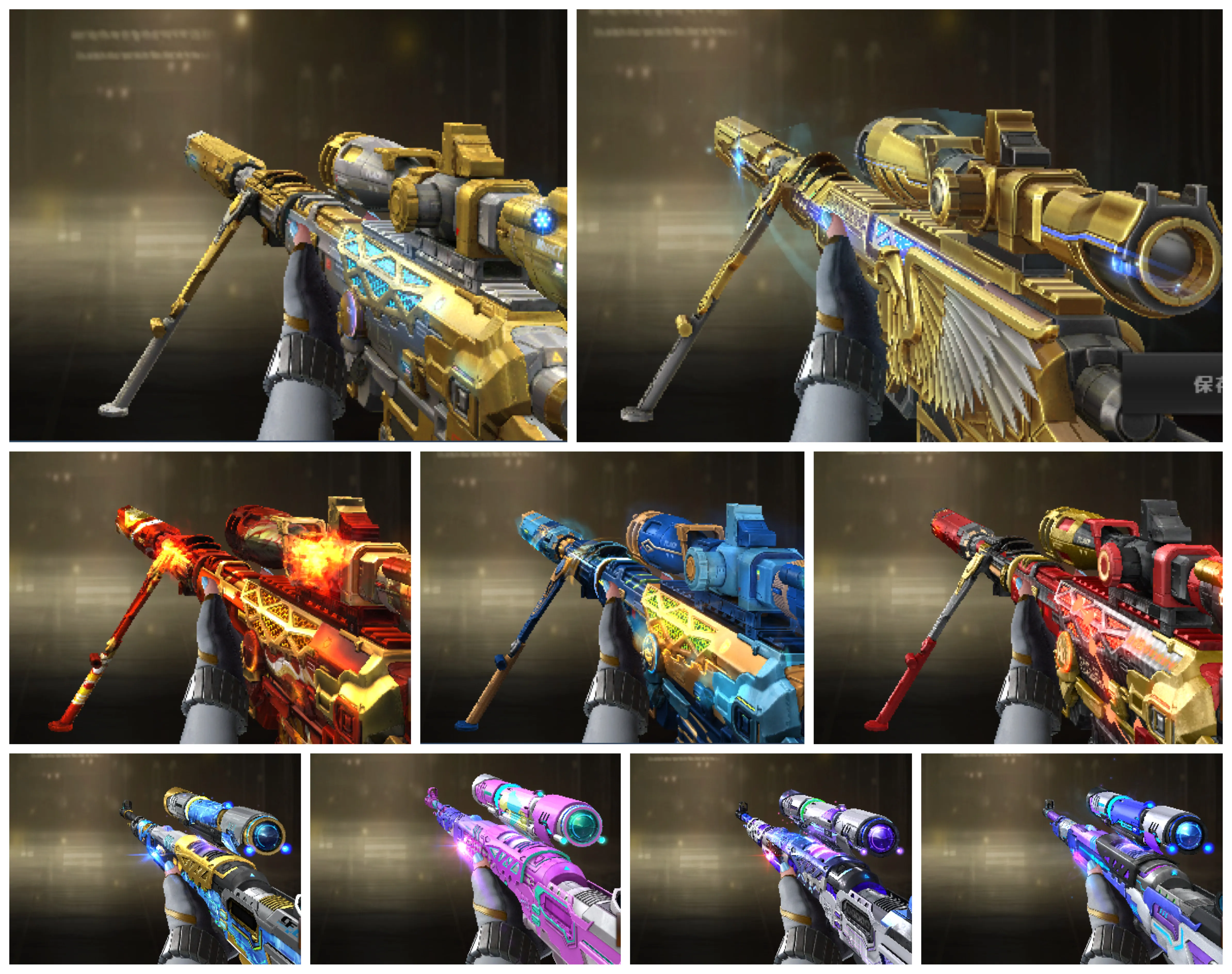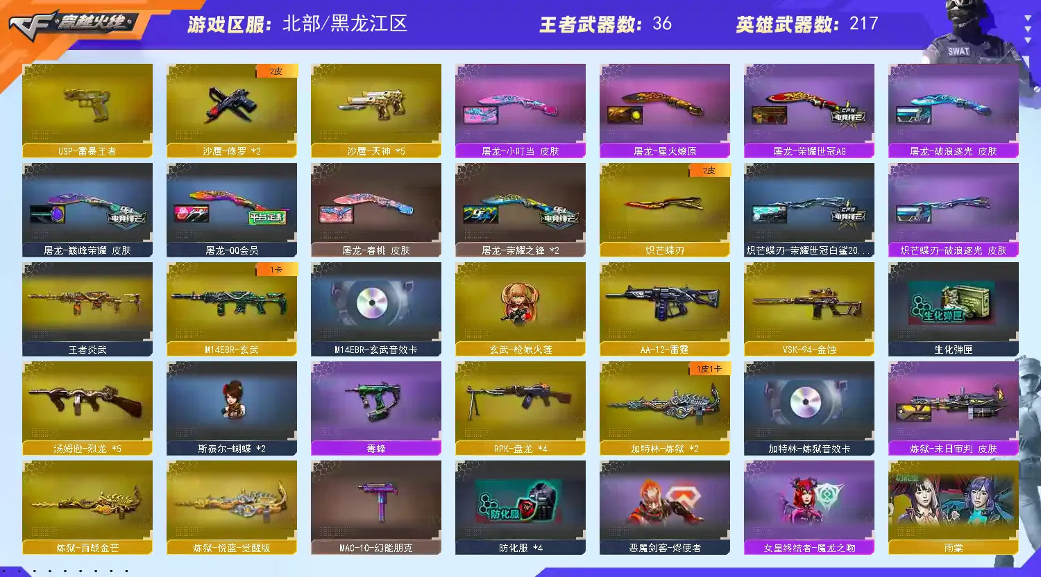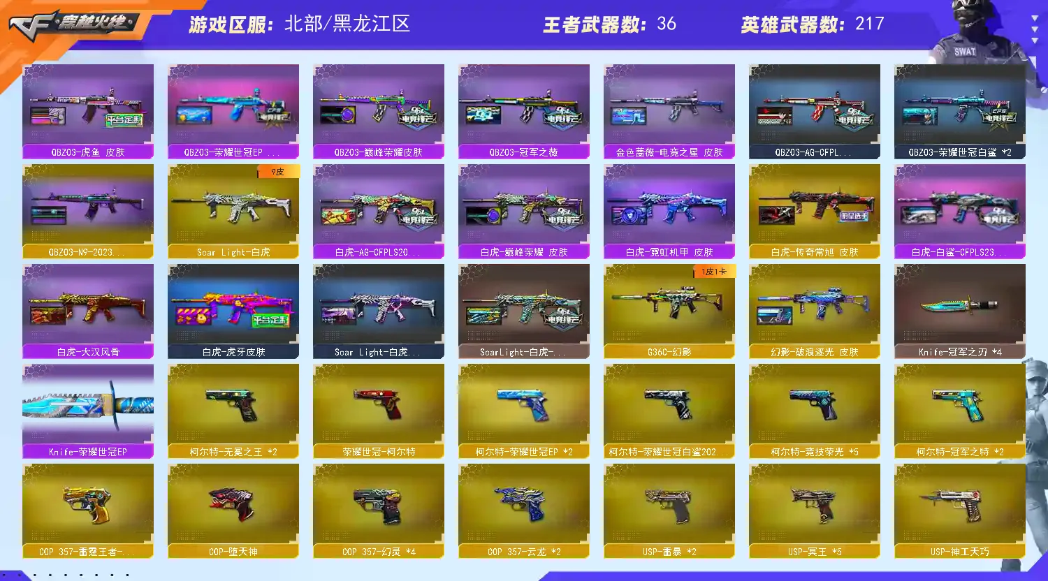稀有武器:王者风神、传说辉光、传说暗裔、传说圣灵、白虎(AG皮肤)、玄武、星神、双幻神(CFS2022、巅峰荣耀、黄忠)+音效卡、M200-竞技荣光 、白虎之魄