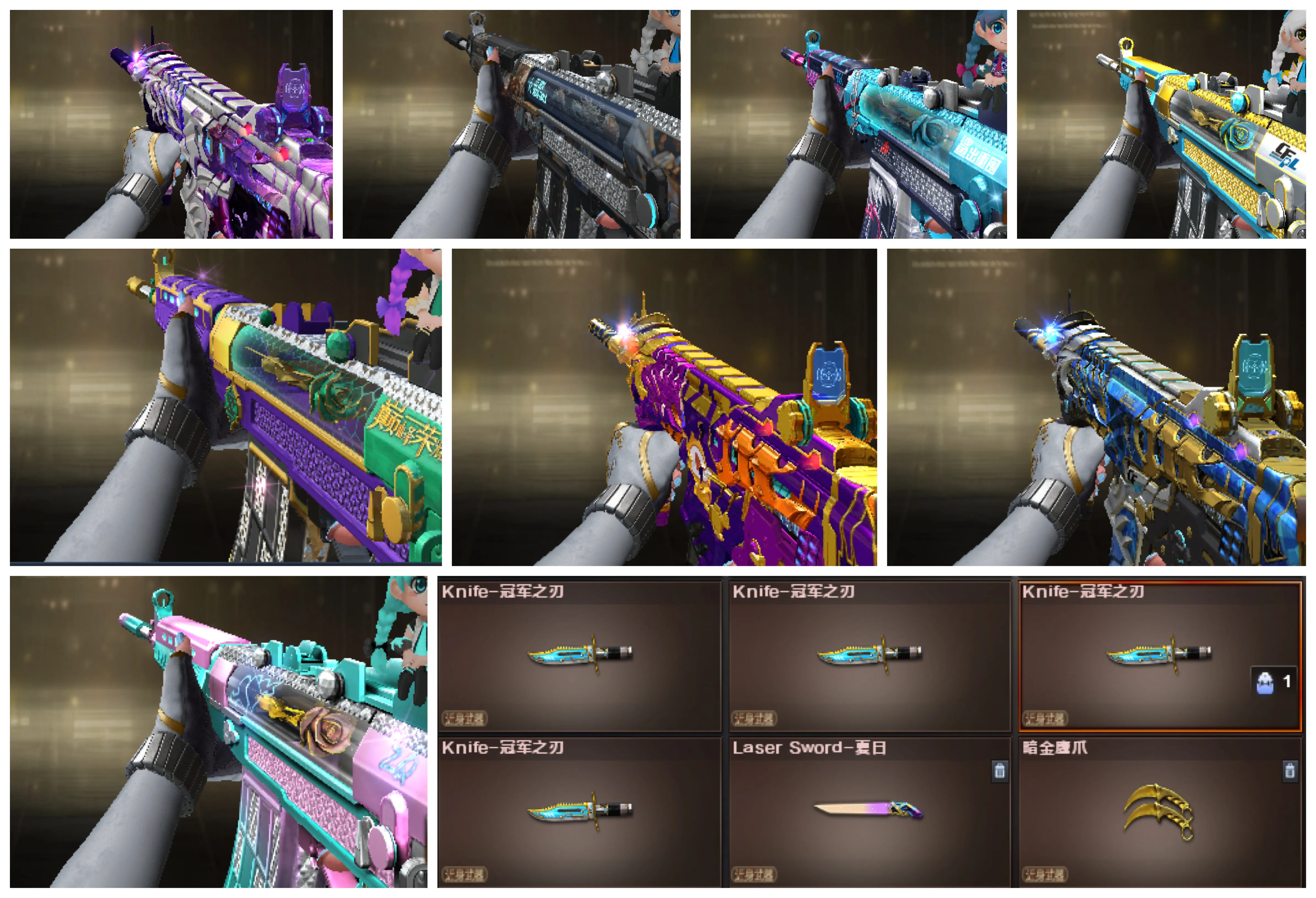 近战武器:屠龙×4(荣耀×2、AG、)、王者玉锋、擎天、龙啸、蝴蝶刀、冠军之刃×4、麒麟刺