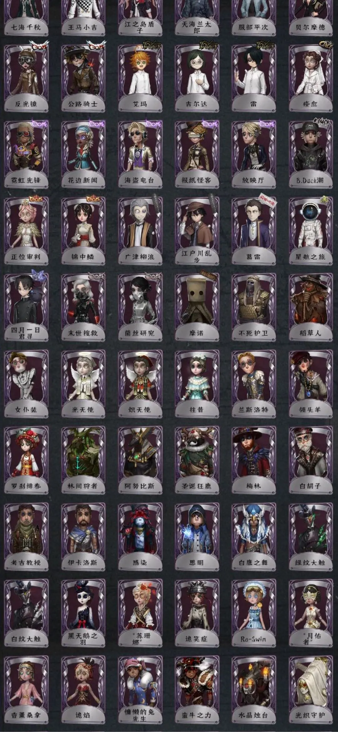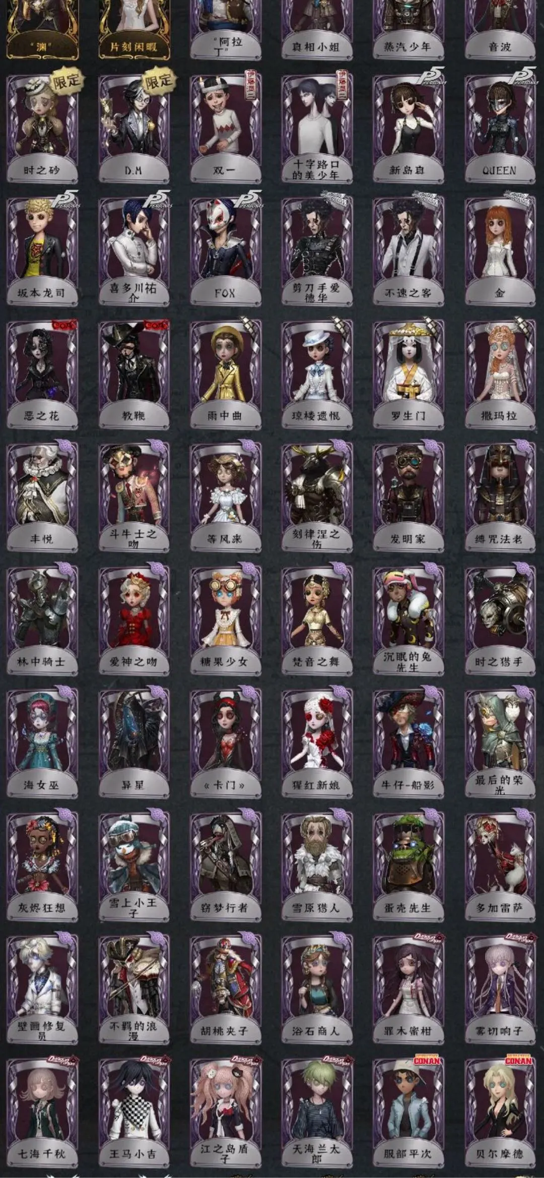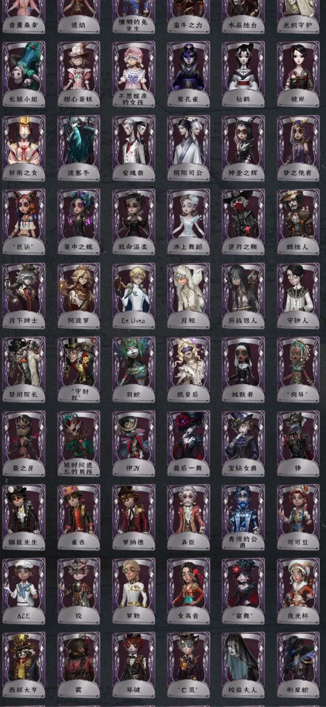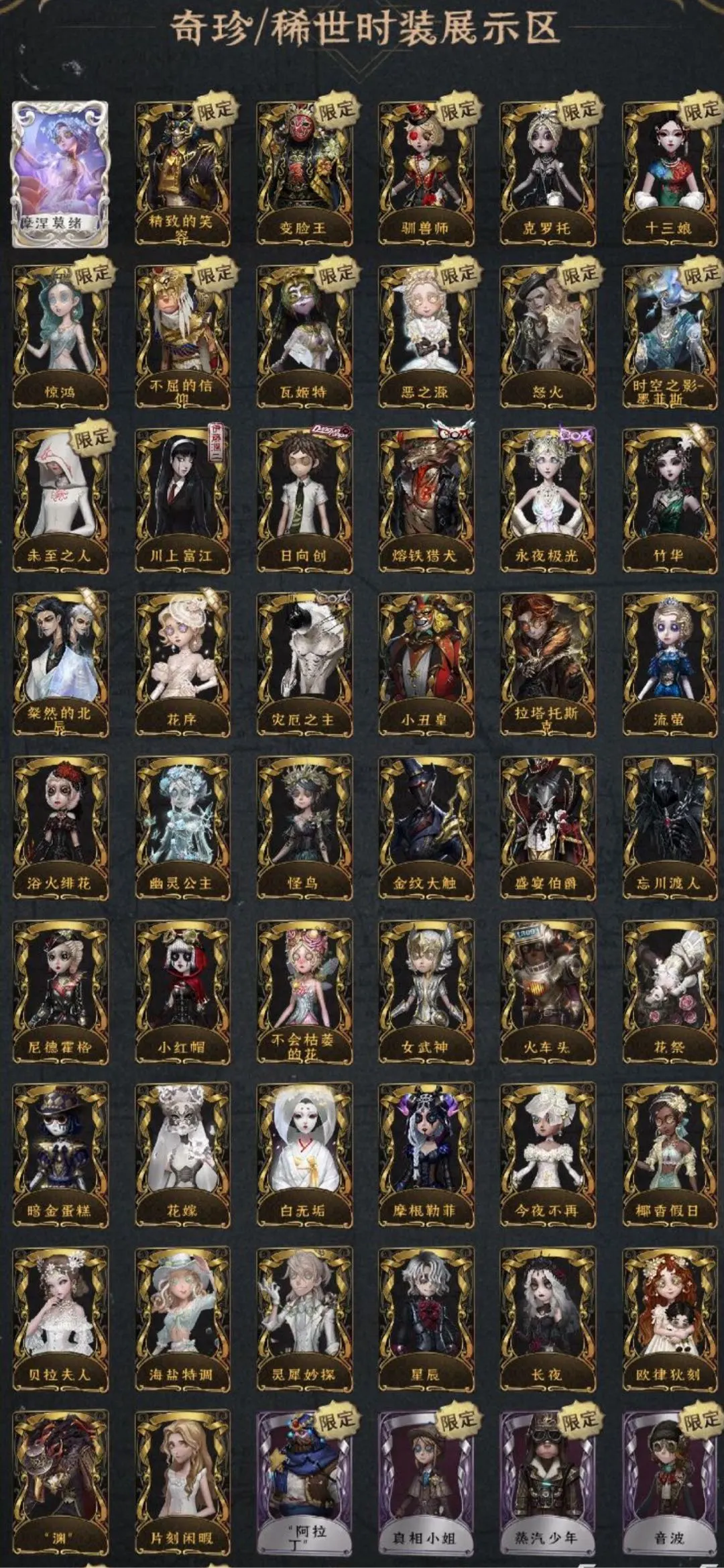 全角色迷雾山庄【共享时装】忘川渡人 溯光 墨菲斯的门廊 垂泪的神女 谪仙 司药 花千树 天河 鬼烛 亚兹拉尔 引路人 星之王 冠军舵手 灾厄之主 粲然的北辰 小丑皇 女武神 椰香假日 欧律狄刻小丑新春限定 拉塔托斯克 竹华 长生 阴阳司公调香师虚妄杰作双金挂摩涅莫绪涅之梦长夜星辰精致的笑容驯兽师克罗托 十三娘 惊鸿 不屈的信仰瓦姬特 恶之源 怒火 川上富江 花序 日向创 熔铁猎犬 永夜极光 流萤 浴火绯花 幽灵公主 怪鸟 盛宴伯爵 尼德霍格 小红帽 不会枯萎的花 火车头 花祭 暗金蛋糕 花嫁 金纹大触 白无垢 摩根勒菲 今夜不再 贝拉夫人 海盐特调渊 锦中鳞 阿拉丁 真相小姐 蒸汽少年 音波 时之砂 DM 服部平次 贝尔摩德 双一 美少年 新岛真 OUEEN 坂本龙司 喜多川祐介 FOX剪刀手爱德华 不速之客 金 罪木蜜甜 雾切响子 七海千秋 江之岛盾子 恶之花 教鞭 等风来 刻律涅之伤 发明家 缚咒法老 林中骑士 糖果少女 梵音之舞 沉眠的免先生 时之猎手 异星 《卡门》猩红新娘 最后的荣光 窃梦行者 雪原猎人 蛋壳先生 雨中曲 琼楼遗恨 罗生门 萨玛拉 反光镜 公路骑士 艾玛 吉尔达 雷 霓虹先锋 花边新闻 海盗电台 报纸怪客 放映厅 B.Duck潮 不死护卫 稻草人 女仆装 光天使 炽天使 往昔 兰斯洛特 领头羊 罗刹绯春 林间狩者 阿努比斯 圣诞狂鹿梅林 白胡子 考古教授 伊卡洛斯感染 思明 白鹰之舞 绿纹大触 白纹大触 黑天鹅之羽 正位审判 苏珊娜诡笑症 Re-Swim 月佑者 慵懒的免先生 蛮牛之力 水晶烛台 长腿小姐 甜心蛋糕 不愿醒来的女孩 紫孔雀 仙鹤 彼岸 祈雨之女波蜜冬 安魂曲 神圣之辉 梦之使者 厄运 笼中之蝶 致会温柔 冰上圆面 逆刃之鞭 蜡烛人 月下绅士 阿波罗 En Ligne月相 历战猎人 禁闭院长 守财奴羽蛇 纸皇后 缄默者 向导 噩之牙 被时间遗忘的男孩 伊万 最后一舞 鼹鼠先生 雀舌 罗纳德 弄臣 可可豆 ACE 狡 罗勒 女高音 西部大亨 琴键校监夫人 衔尾蛇 玛利亚 球球藏 罪木蜜甜 七海千秋 毁誉之印 潘多拉 绝境航船夏 涅槃 至识之眼