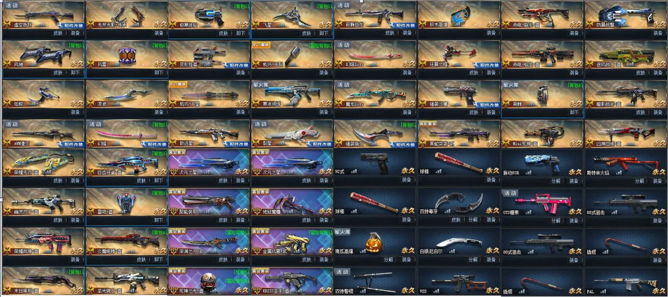 【其他武器】炎魔咆哮·壹、荣耀战神·壹、末日审判·壹、圣光骑士·壹、幽灵双子·壹、巨齿狂鲨·壹、荣耀无双·壹、圣手·壹、双持警棍、白银尼泊尔、毁灭者、脉动93R、MP5掠食者