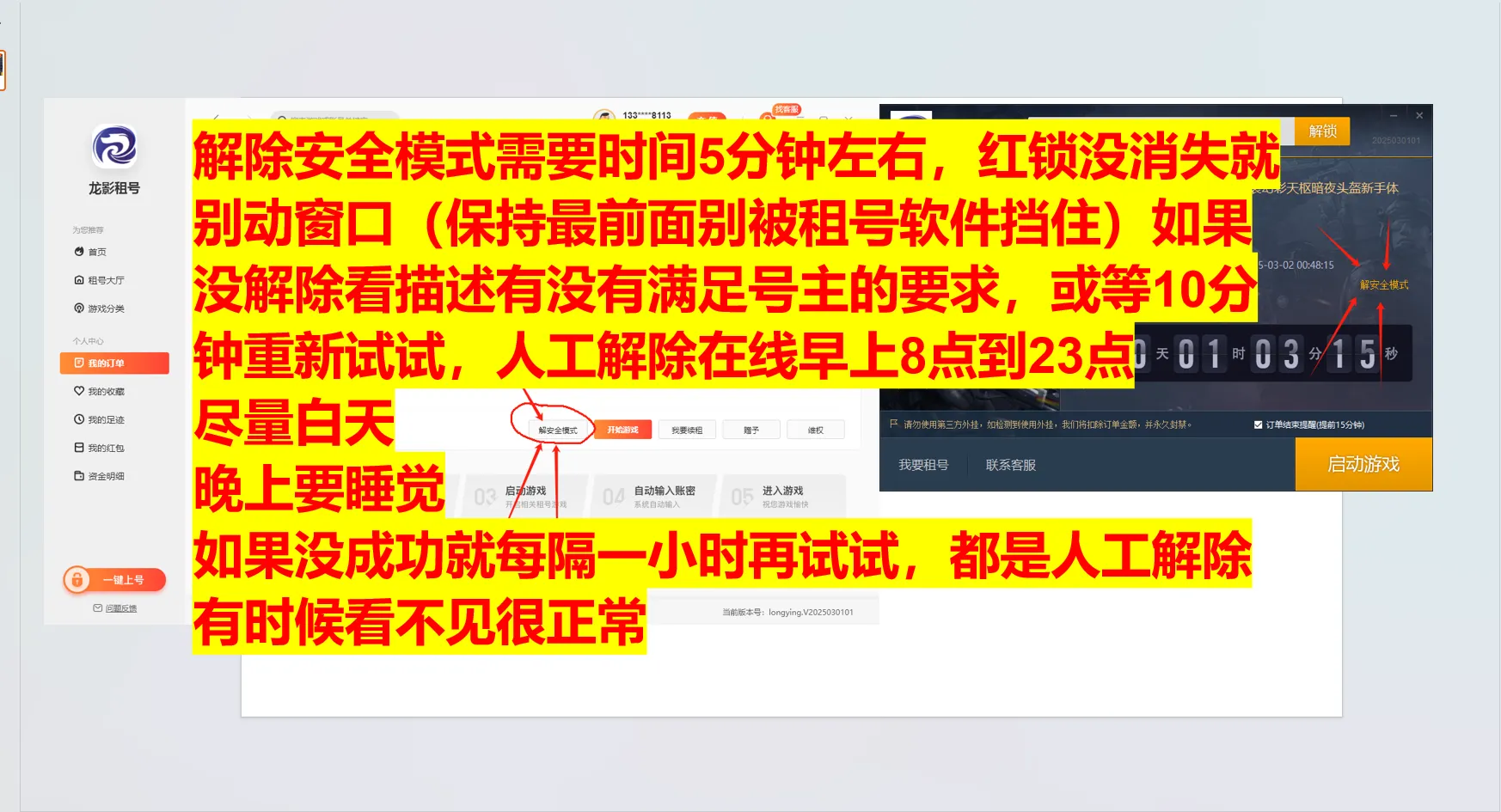 深夜休息,无法解除。大半夜租一个小时要解除安全模式的,号主休息了,解不开凑合玩(再wegame启动游戏就行了).安全模式都是号主自己手动解除,深夜休息不能解除。