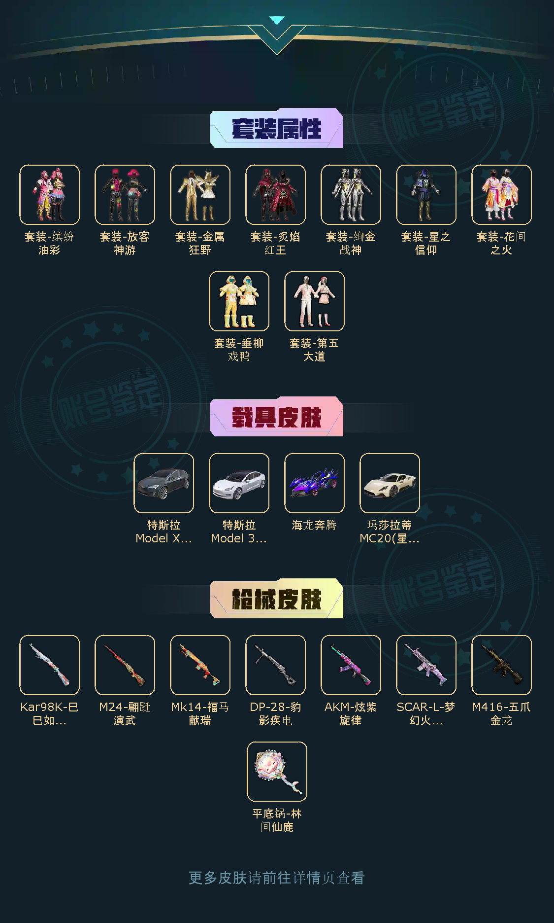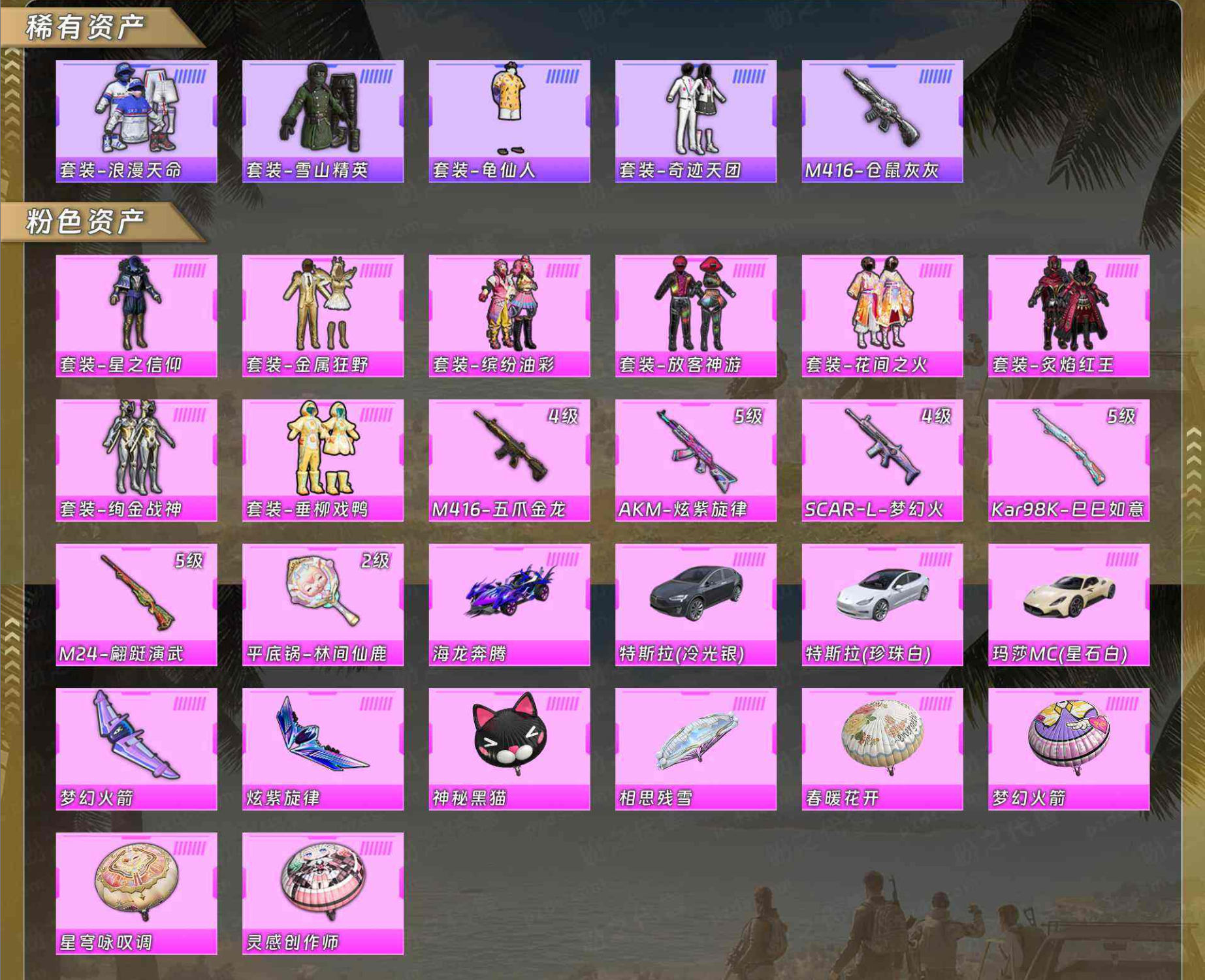 【稀有资产】套装-浪漫天命/套装-雪山精英/套装-龟仙人/套装-奇迹天团/M416-仓鼠灰灰
