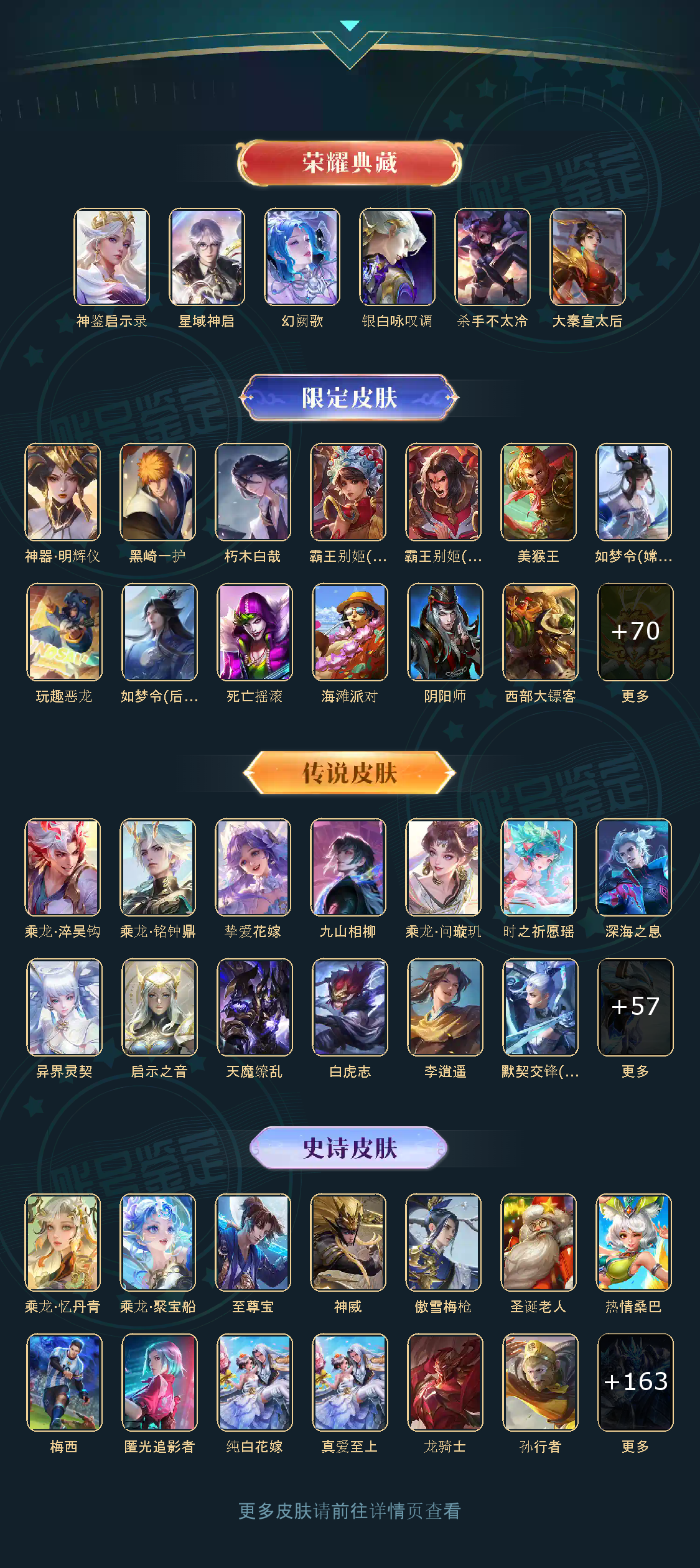 ,英雄数量125,典藏皮肤数6,皮肤数量501,纯白花嫁/天魔缭乱/至尊宝/真爱至上/圣诞老人/热情桑巴/梅西/青龙志/白虎志/朱雀志/久胜战神/飞衡/匿光追影者/神器·明辉仪/乘龙·问璇玑/神鉴启示录/无双飞将/时之祈愿瑶/星域神启/李逍遥/武圣/幻阙歌/乘龙·淬吴钩/乘龙·铭钟鼎/深海之息/玉兔公主/补天/乘龙·聚宝船/异界灵契/神威/启示之音/乘龙·忆丹青/银白咏叹调/傲雪梅枪/时雨天司/纯白花嫁/天魔缭乱/至尊宝/真爱至上/圣诞老人/热情桑巴/梅西/青龙志/白虎志/朱雀志/久胜战神/飞衡/匿光追影者/神器·明辉仪/乘龙·问璇玑/神鉴启示录/无双飞将/时之祈愿瑶/星域神启/李逍遥/武圣/幻阙歌/乘龙·淬吴钩/乘龙·铭钟鼎/深海之息/玉兔公主/补天/乘龙·聚宝船/异界灵契/神威/启示之音/乘龙·忆丹青/银白咏叹调/傲雪梅枪/时雨天司