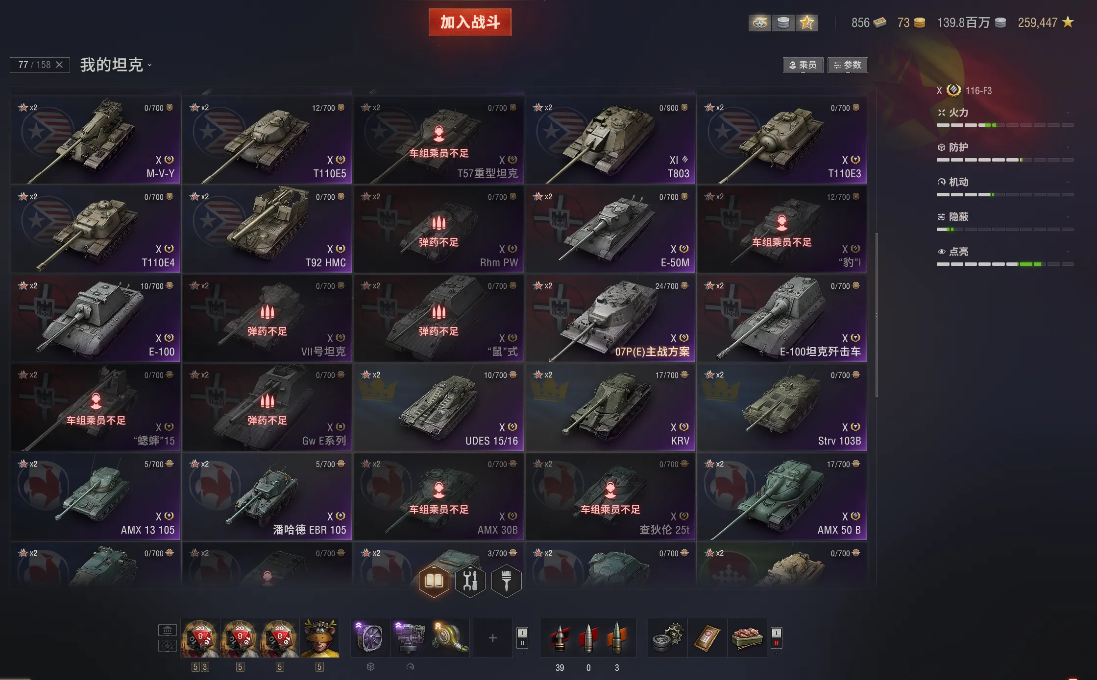 11级KR-1,T803。10级76X全系,所有银币10级全部在库。10金:116F3,铲子豹,T22,268v型,113,121b,183,伏羲155,121b等。9金19台:SDT-58v,SU-122v,守望者,维钦托利,590,T-54d,眼镜蛇,1b概念,BZ-58-2,wz114等。8金27台:法蝎(sfac105),SZDVvz,BZ-74-1,查狄伦暴风,反制者,AMBT等等。
