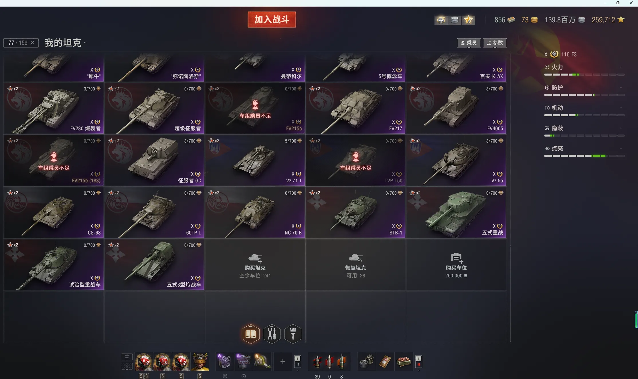 注意事项:1,进入游戏后,如果车辆情况不符。那是因为前面的玩家筛选了自己玩的坦克,其他的隐藏了。坦克显示栏,左下角小坦克标志,点进去把所有系别和级别选上,坦克就全部出来了。