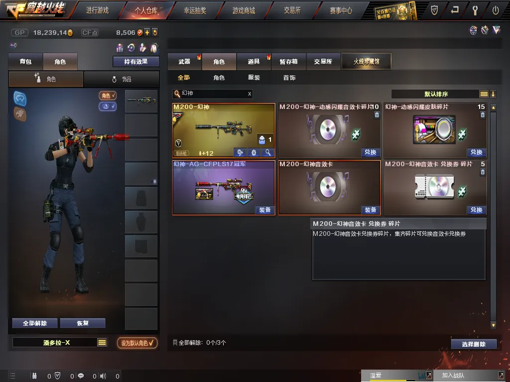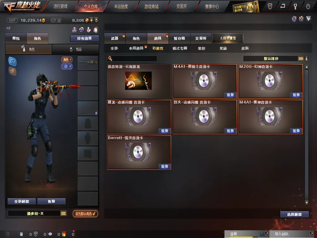 道具:防弹衣;防弹头盔;M4A1-黑骑士音效卡;C4工具钳;手雷包;步枪弹匣;烟雾保护头盔;极限战斗背包;手雷包;M200-幻神音效卡