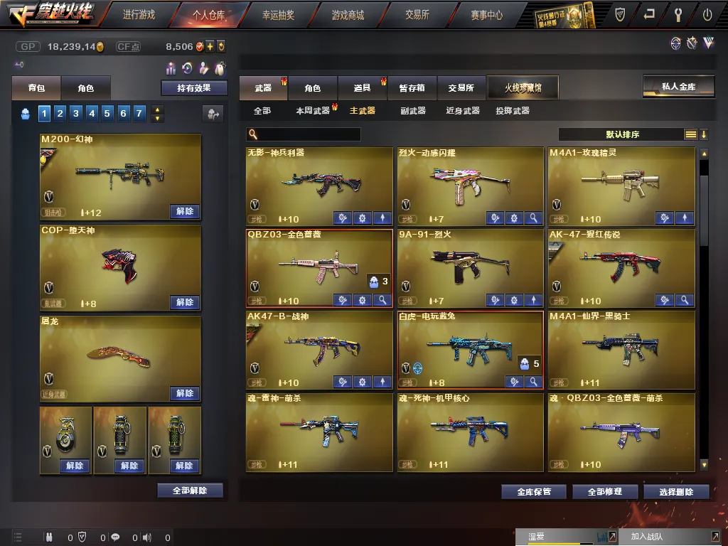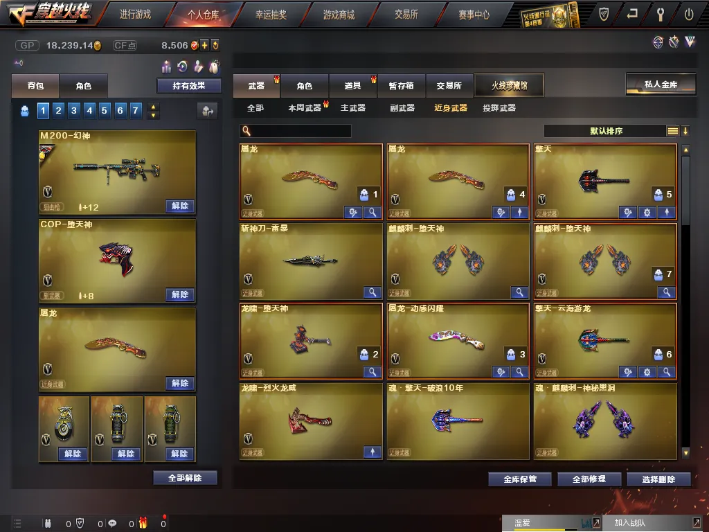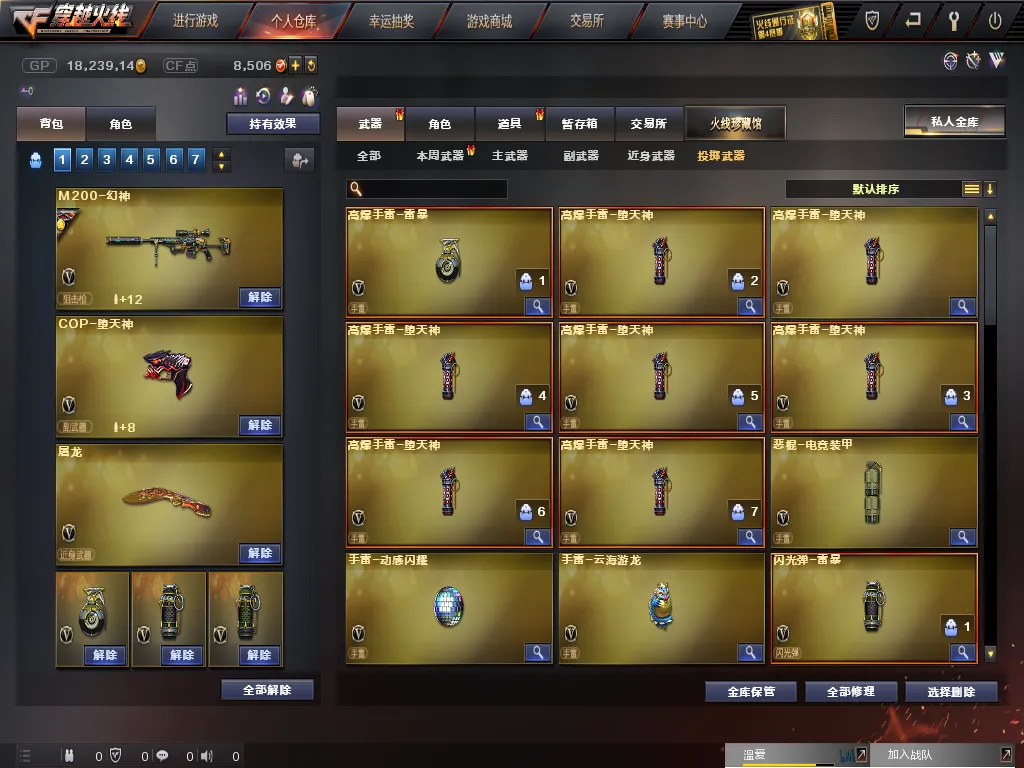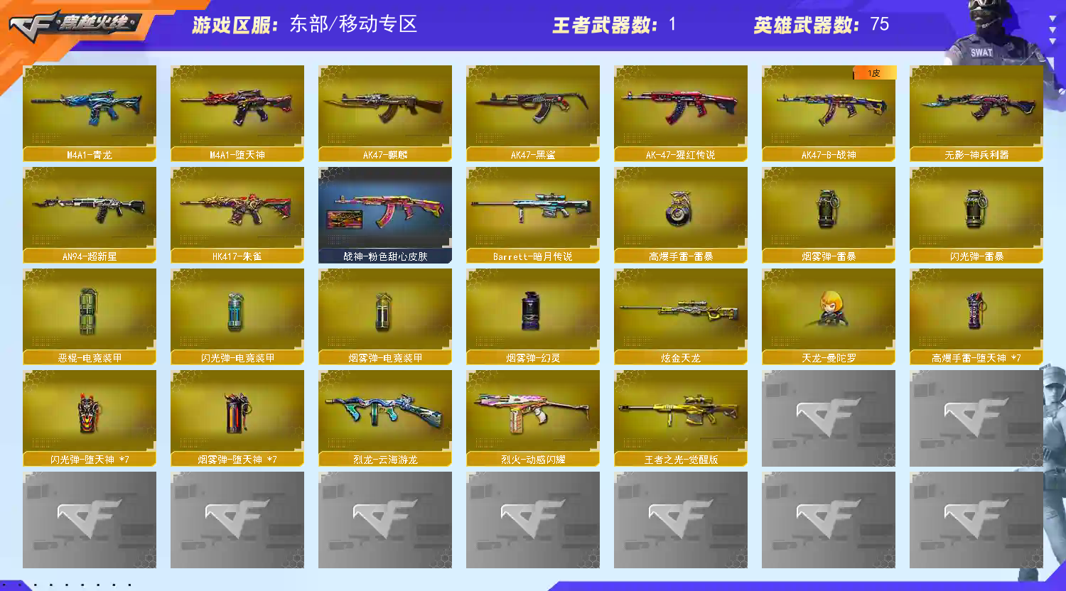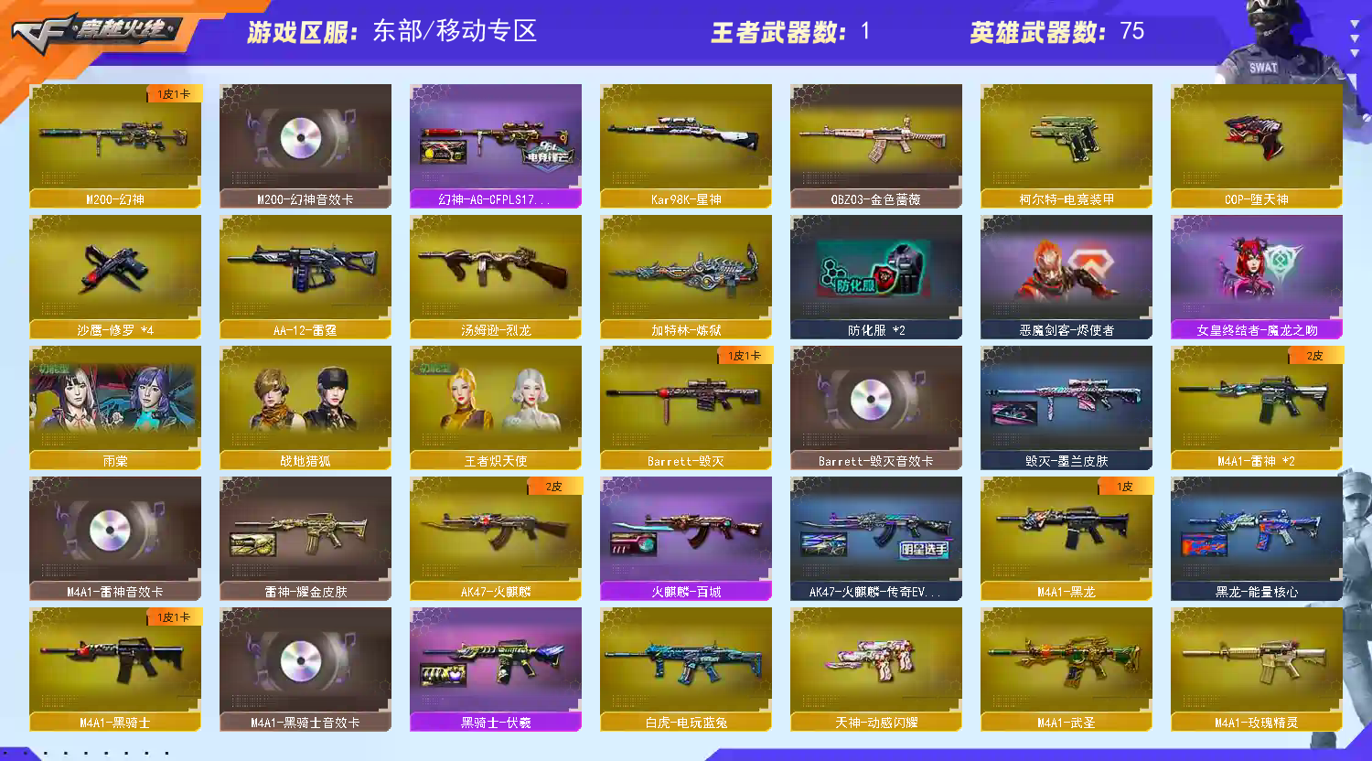 英雄武器:高爆手雷-堕天神;屠龙;M4A1-堕天神;闪光弹-堕天神;烟雾弹-堕天神;M200-幻神;沙鹰-修罗;烟雾弹-幻灵;Barrett-暗月传说;AK-47-猩红传说;白虎-电玩蓝兔;AK47-B-战神;擎天;龙啸-烈火龙威;手雷-云海游龙;柯尔特-电竞装甲;天神-动感闪耀;烈火-动感闪耀;屠龙-动感闪耀;烟雾弹-电竞装甲;龙啸-堕天神;烈龙-云海游龙;M4A1-青龙;M4A1-雷神;麒麟刺-堕天神;COP-堕天神;AK47-火麒麟;手雷-动感闪耀;擎天-云海游龙;恶棍-电竞装甲;AA-12-雷霆;斩神刀-雷暴;无影-神兵利器;闪光弹-电竞装甲;高爆手雷-雷暴;汤姆逊-烈龙;Barrett-毁灭;M4A1-玫瑰精灵;AK47-麒麟;M4A1-黑龙;烟雾弹-雷暴;AK47-黑鲨;M4A1-黑骑士;Kar98K-星神;QBZ03-金色蔷薇;闪光弹-雷暴;AN94-超新星;M4A1-武圣;9A91-烈火;HK417-朱雀;加特林-炼狱