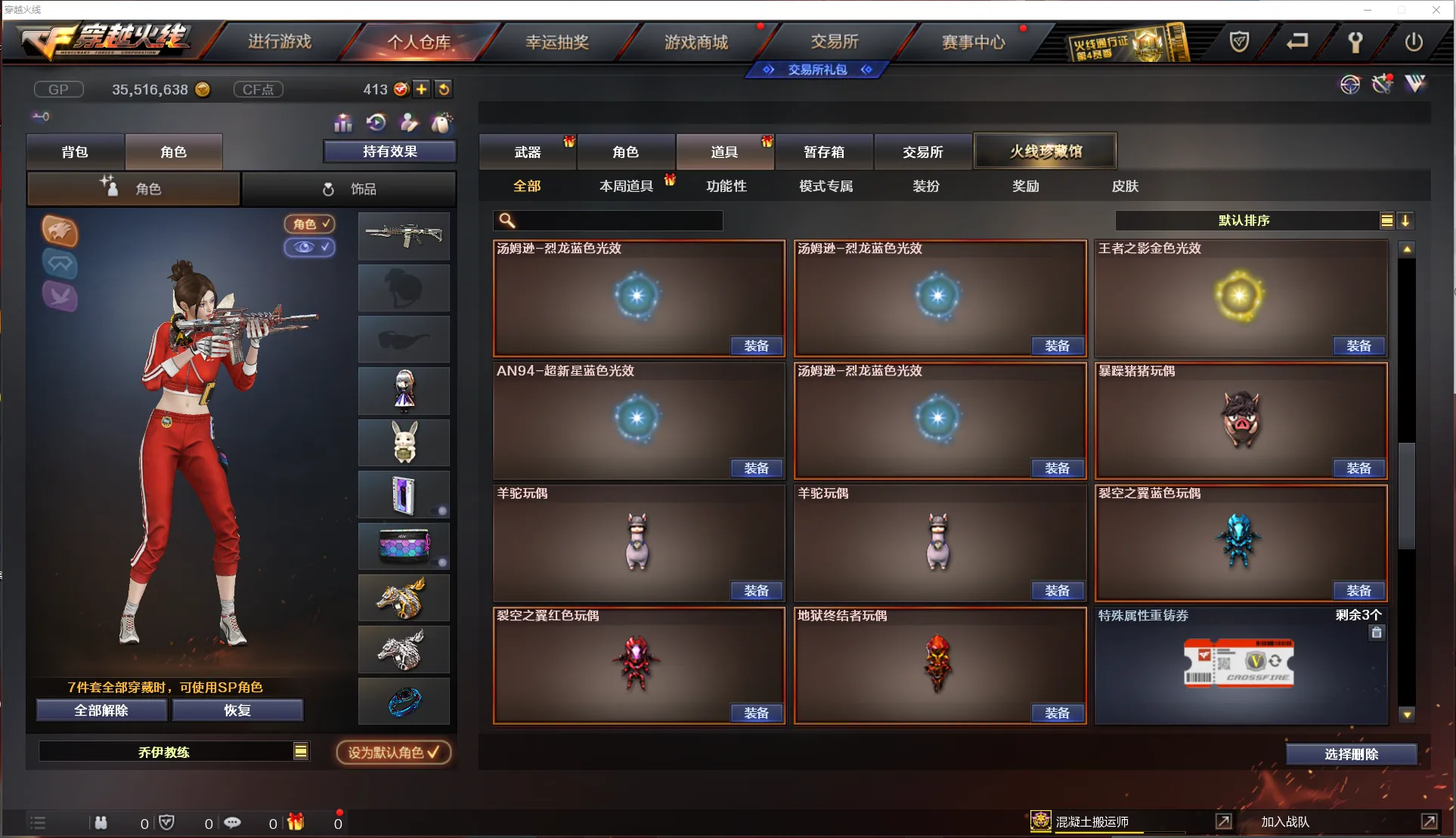 【道 具】:暴躁猪猪玩偶、裂空之翼红色玩偶、7个背包、AC(防弹衣+防弹头盔)、C4工具钳、手雷包、挑战弹夹、夺命之镰、变异宝贝、灵魂忍者、生化弹夹、防化服、机枪弹夹、冲锋枪弹夹、散弹枪弹夹、手枪弹夹、狙击枪弹夹、步枪弹夹