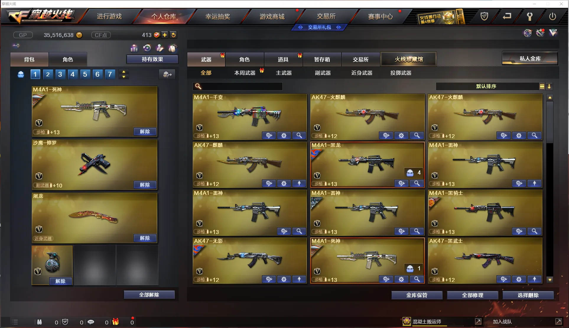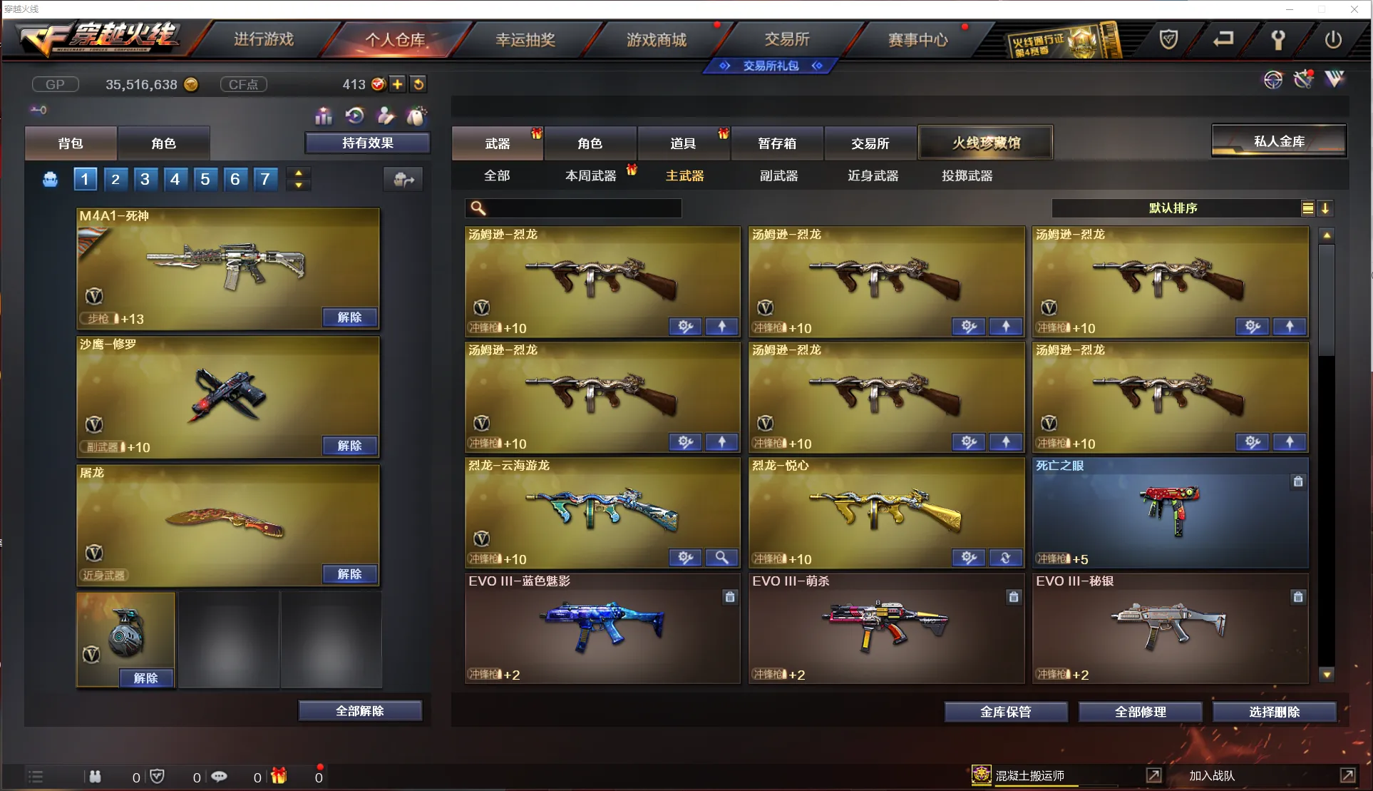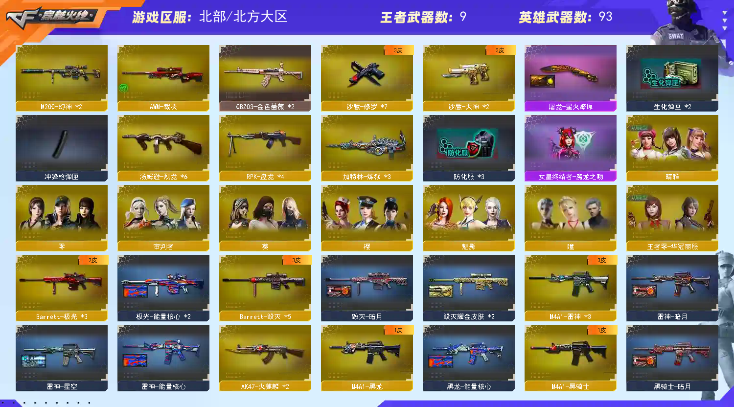 【主 武】:M200幻神、6烈龙斯泰尔死亡之眼、4盘龙加特林炼狱、炫金天龙、王者之幻、王者之怒、千变、火麒麟X2、麒麟、黑龙、雷神X3、无影、黑骑士、死神、黑武士X2、天启、超新星、武圣、机械迷城X3、龙血、无影神兵利器、烈火动感闪耀、玫瑰精灵、金色蔷薇、烈火、猩红传说、海王、天龙X3、毁灭X3、极光X3、裁决、毁灭征服者、冰龙粉碎者、机甲撕裂者、激光毁灭者、圣炎切割者、深渊巨龙咆哮、神圣爆裂者、试炼破坏者、苍雷、金魔等各种活动武器
