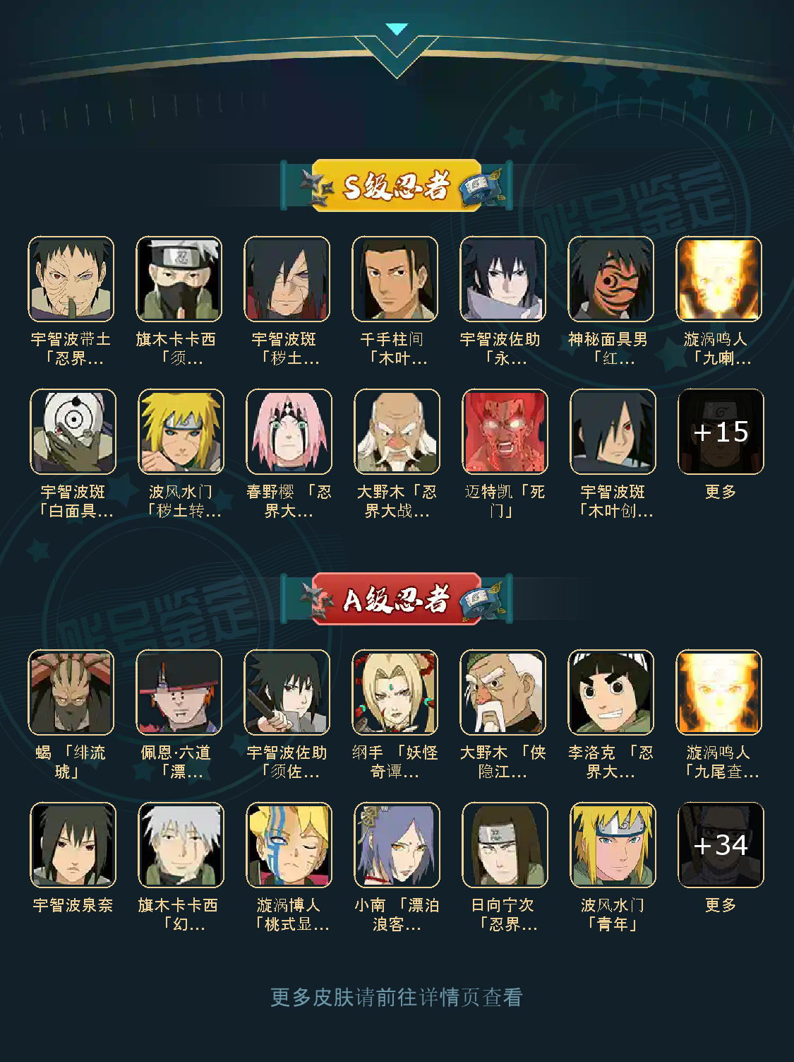 战力:1340W+;S忍25个;A忍37个,通灵兽21个,S忍:普通纲手猿飞日斩九喇嘛鸣人永恒万花筒佐助忍战樱大蛇丸百豪纲手死门凯波风水门秽土水门秽土猿飞秽土扉间木叶创立柱间秽土柱间木叶创立斑秽土解斑须佐鼬秽土鼬白面具忍战带土红夜面具男罗砂