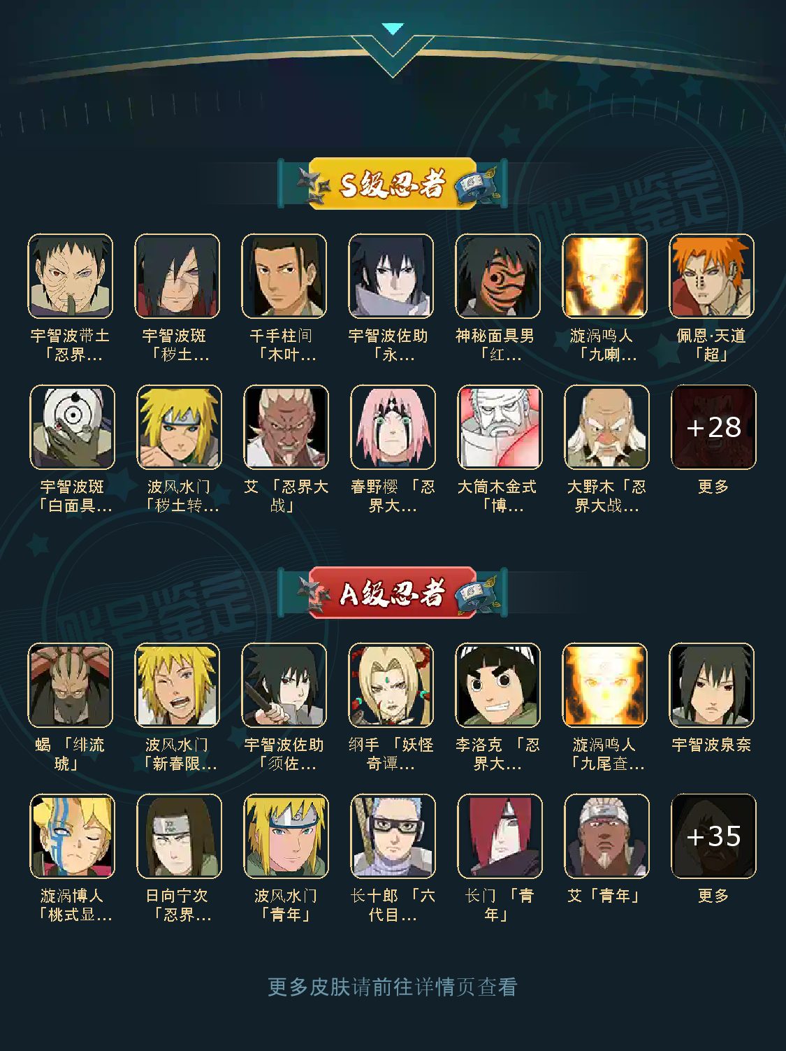 战力:1825W+;VIP13级;S忍41个;A忍42个,通灵兽22个,S忍:5星纲手(普通),4星仙人模式自来也,4星大蛇丸,4星猿飞日斩(普通),九喇嘛连结漩涡鸣人,永恒万花筒宇智波佐助,忍界大战春野樱,百豪纲手,自来也(普通),舞之豪杰自来也,死门迈特凯,波风水门(普通),秽土转生波风水门,秽土转生猿飞日斩,秽土转生千手扉间,千手扉间(普通),千手柱间(普通),木叶创立千手柱间,秽土转生千手柱间,秽土转生宇智波斑,木叶创立宇智波斑,秽土转生解宇智波斑,须佐能乎宇智波鼬,秽土转生宇智波鼬,神秘面具男(普通),白面具宇智波斑,忍界大战宇智波带土,红夜之刃神秘面具男,四代目风影罗砂,二代目水影鬼灯幻月,三代目雷影艾,三代目土影大野木,忍界大战大野木,秽土转生半藏,二代目土影无,超佩恩天道,秽土转生长门,仙人模式药师兜,博人传大筒木金式, ;A忍:5星迈特凯(普通),5星猿飞阿斯玛(普通),5星蝎(普通),5星干柿鬼鲛(普通),4星疾风传我爱罗,4星飞段(普通),3星青年艾,3星须佐能乎宇智波佐助,3星死司凭血飞段,万花筒写轮眼宇智波佐助,忍界大战日向宁次,宇智波止水(普通),近松十人卫千代,百豪春野樱,九尾查克拉漩涡鸣人,万花筒写轮眼旗木卡卡西,新春限定波风水门,青年波风水门,忍界大战我爱罗,忍界大战秋道丁次,仙人模式漩涡鸣人,青年长门,晓大蛇丸,新春限定宇智波鼬,木叶上忍猿飞木叶丸,五代目水影照美冥,角都(普通),忍界大战奇拉比,加藤断,宇智波鼬(普通),迪达拉(普通),漂泊武士千手扉间,半蛇斗篷药师兜,新春限定小南,五代目雷影达鲁伊,秽土转生迪达拉,暴怒宇智波带土,六代目水影长十郎,奇拉比(普通),小南(普通),夏日泳装小南,四代目土影黑土, ;通灵兽:忍犬(普通),蓝蛇,蛤蟆吉,忍龟,猿魔,镰鼬,熊猫,山椒鱼,蛞蝓(普通),蜃,蛤蟆仙人,鲛鲨,蛤蟆龙,蛤蟆健,乌鸦,一尾守鹤,梦貘,二尾又旅,蛤蟆广,鹰,怒鬼爪,蜘蛛