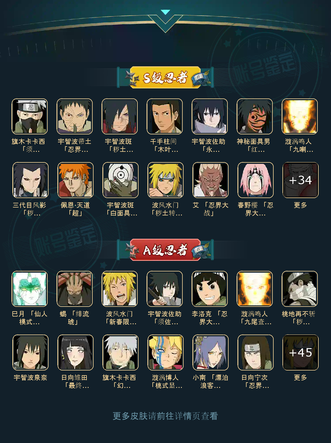 战力:2278W+;VIP14级;S忍45个;A忍49个,通灵兽28个,S忍:5星纲手(普通),5星猿飞日斩(普通),4星仙人模式自来也,4星大蛇丸,4星波风水门(普通),4星白面具宇智波斑,九喇嘛连结漩涡鸣人,永恒万花筒宇智波佐助,忍界大战春野樱,自来也(普通),舞之豪杰自来也,百豪纲手,死门迈特凯,秽土转生波风水门,秽土转生猿飞日斩,秽土转生千手扉间,千手扉间(普通),千手柱间(普通),秽土转生千手柱间,木叶创立千手柱间,宇智波斑(普通),秽土转生宇智波斑,木叶创立宇智波斑,秽土转生解宇智波斑,须佐能乎宇智波鼬,秽土转生宇智波鼬,神秘面具男(普通),忍界大战宇智波带土,红夜之刃神秘面具男,四代目风影罗砂,秽土转生三代目风影,二代目水影鬼灯幻月,四代目雷影艾,三代目雷影艾,秽土转生金角银角,三代目土影大野木,忍界大战大野木,二代目土影无,秽土转生半藏,天道佩恩,超佩恩天道,秽土转生长门,仙人模式药师兜,博人传大筒木金式, ;A忍:5星猿飞阿斯玛(普通),5星干柿鬼鲛(普通),5星迈特凯(普通),5星蝎(普通),4星疾风传我爱罗,4星飞段(普通),4星死司凭血飞段,3星木叶上忍猿飞木叶丸,3星旗木卡卡西(普通),3星宇智波止水(普通),3星九尾查克拉漩涡鸣人,3星宇智波鼬(普通),3星迪达拉(普通),3星青年波风水门,3星秽土转生迪达拉,3星半蛇斗篷药师兜,忍者之路神秘面具男,万花筒写轮眼宇智波佐助,须佐能乎宇智波佐助,最终章日向雏田,七夕限定猿飞阿斯玛,夏日泳装照美冥,桃地再不斩,忍界大战日向宁次,秽土转生猿飞阿斯玛,近松十人卫千代,惊门迈特凯,百豪春野樱,万花筒写轮眼旗木卡卡西,新春限定波风水门,忍界大战秋道丁次,忍界大战我爱罗,五代目水影照美冥,幻之真容旗木卡卡西,仙人模式漩涡鸣人,奇拉比(普通),青年艾,青年长门,晓大蛇丸,新春限定宇智波鼬,忍界大战奇拉比,角都(普通),地怨虞角都,漂泊浪客小南,漂泊武士千手扉间,五代目雷影达鲁伊