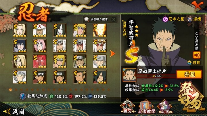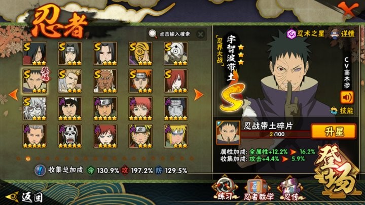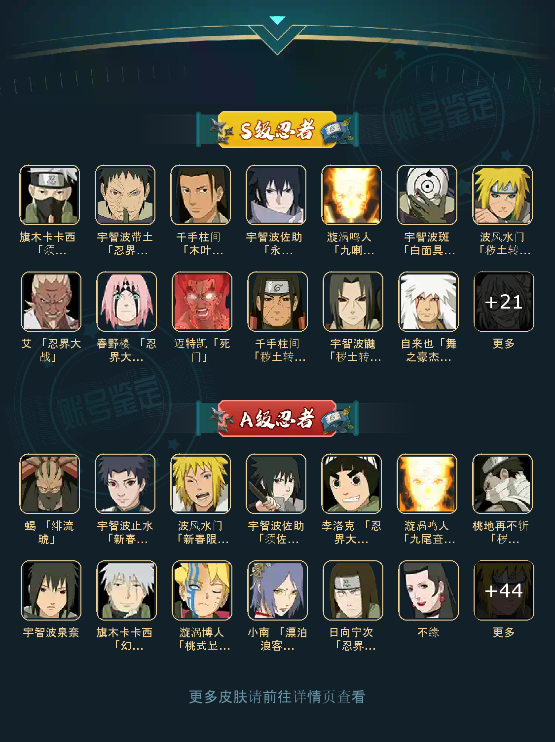 S忍31个;A忍49个,通灵兽23个,S忍:普通纲手猿飞日斩大蛇丸波风水门九喇嘛鸣人永恒万花筒佐助忍战樱仙人自来也普通自来也豪杰自来也百豪纲手死门凯秽土水门秽土猿飞千手扉间秽土扉间千手柱间秽土柱间木叶创立柱间秽土斑宇智波