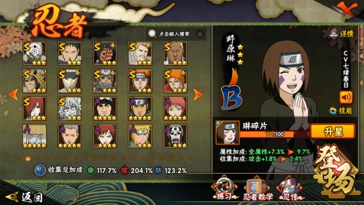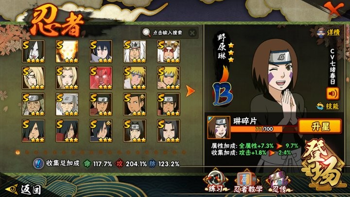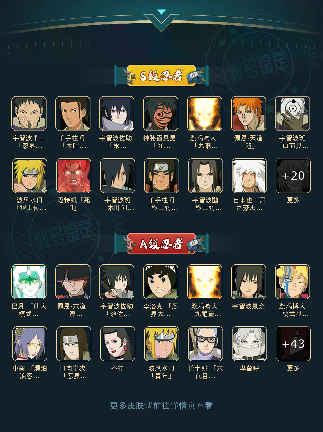 S忍32个;A忍49个,通灵兽19个,S忍:大蛇丸九喇嘛鸣人永恒万花筒佐助普通自来也豪杰自来也普通纲手百豪纲手死门凯波风水门秽土水门秽土猿飞秽土扉间千手柱间木叶创立柱间秽土柱间宇智波斑秽土斑木叶创立斑须佐鼬秽土鼬白面具忍...