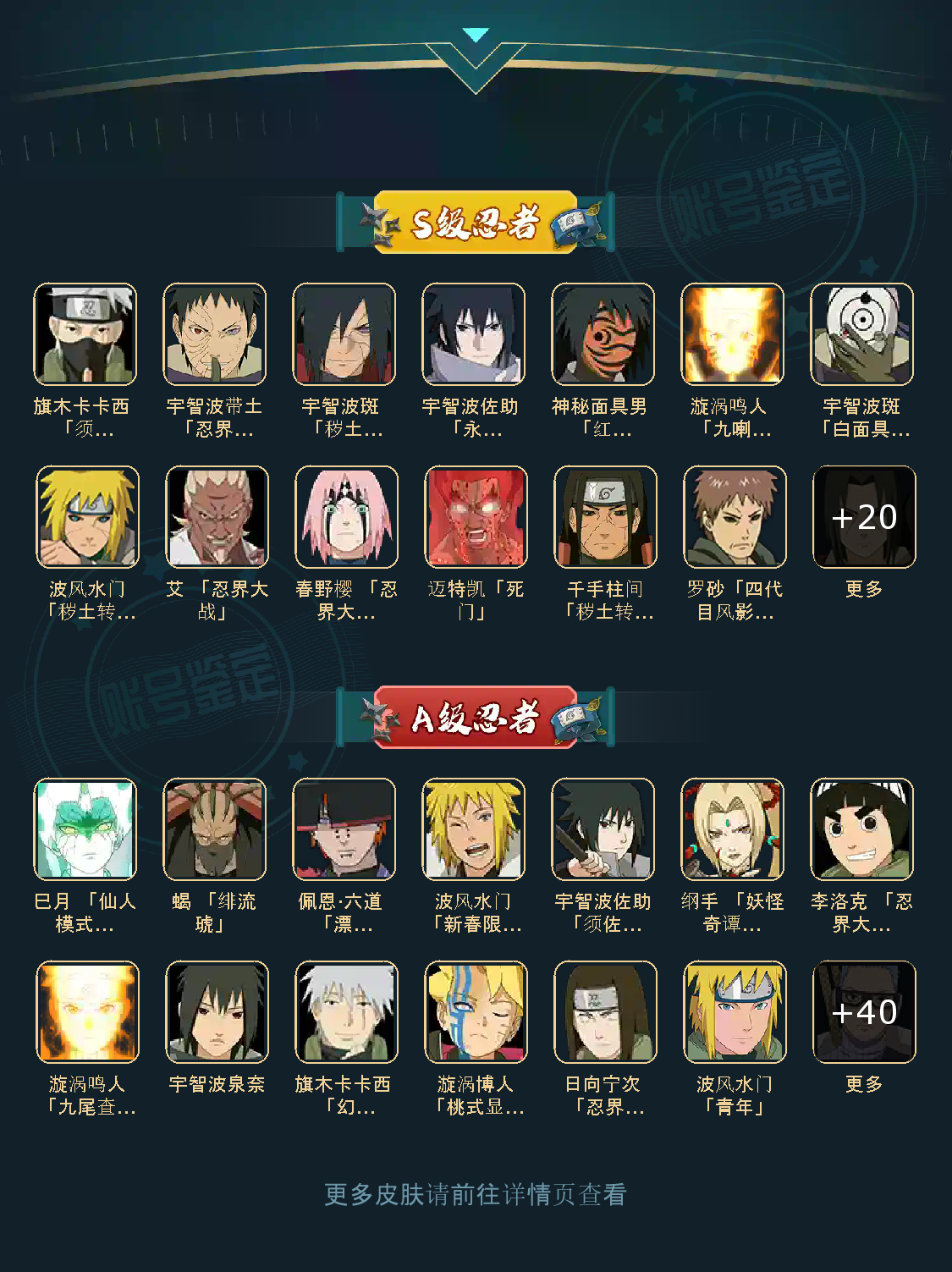:大蛇丸,水门,九喇嘛,永恒佐助,忍战樱,自来也,蜀面,百豪纲手,死门凯,秽土水门,秽土斑,斑,解斑,须佐宇智波鼬,秽土宇智波鼬,虎皮,白面具,忍战带土,红夜带土,罗砂,幻月,四代雷影艾,天道佩恩,