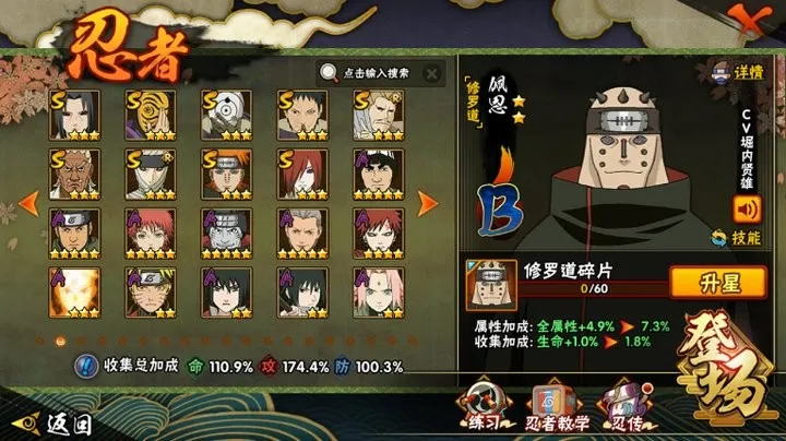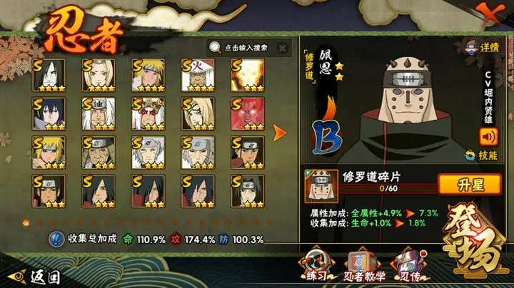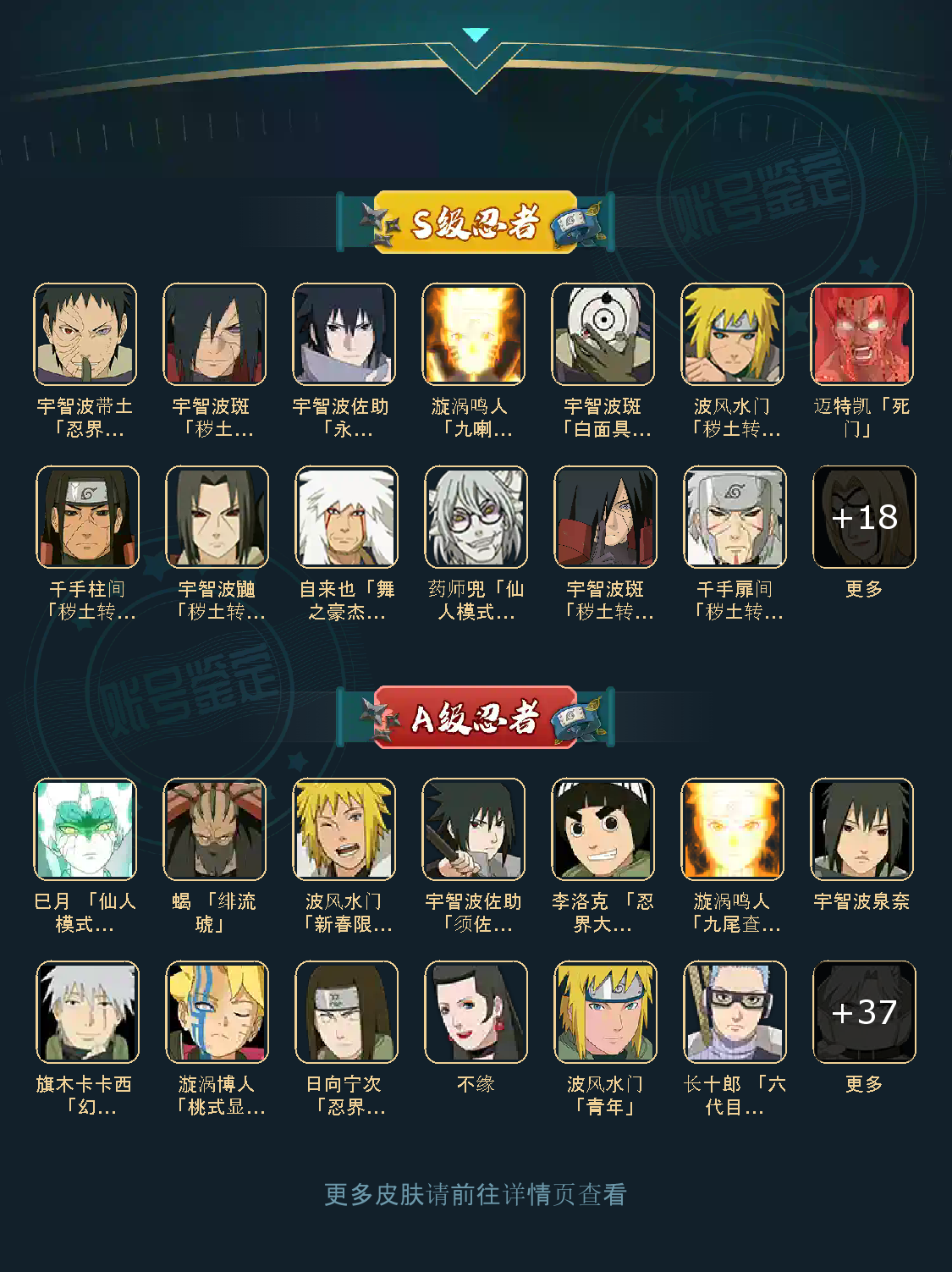 S忍:大蛇丸普通纲手波风水门猿飞日斩九喇嘛鸣人永恒万花筒佐助百豪纲手死门凯普通自来也豪杰自来也秽土水门秽土猿飞千手扉间秽土扉间千手柱间秽土柱间秽土斑宇智波斑秽土解斑须佐..