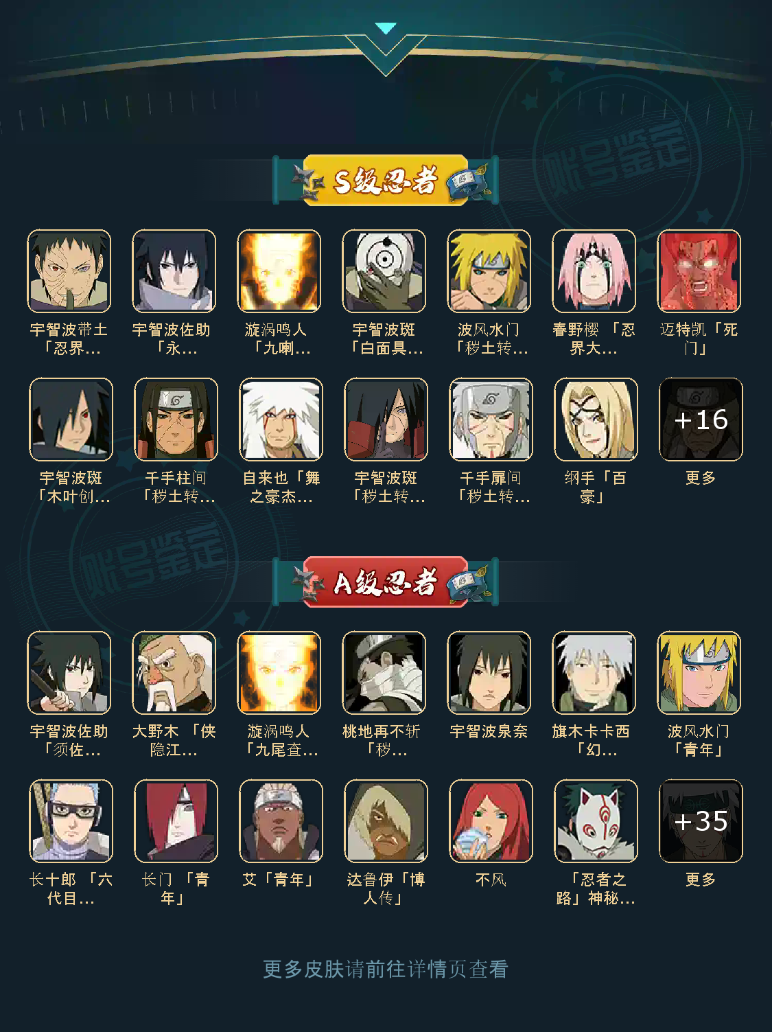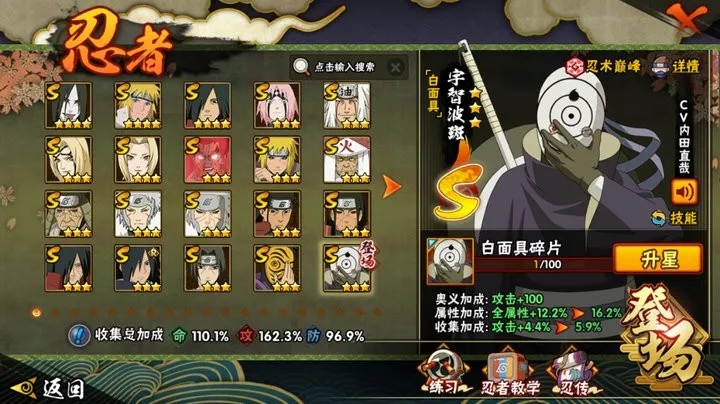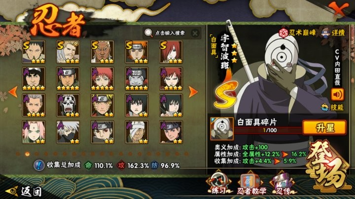 战力:1113W+;VIP11级;S忍25个;A忍39个,通灵兽19个,S忍:大蛇丸波风水门宇智波斑忍战樱普通自来也百豪纲手普通纲手死门凯秽土水门猿飞日斩秽土猿飞秽土扉间千手扉间千手柱间秽土柱间秽土斑木叶创立斑须佐鼬神秘面具男白面具忍战带土