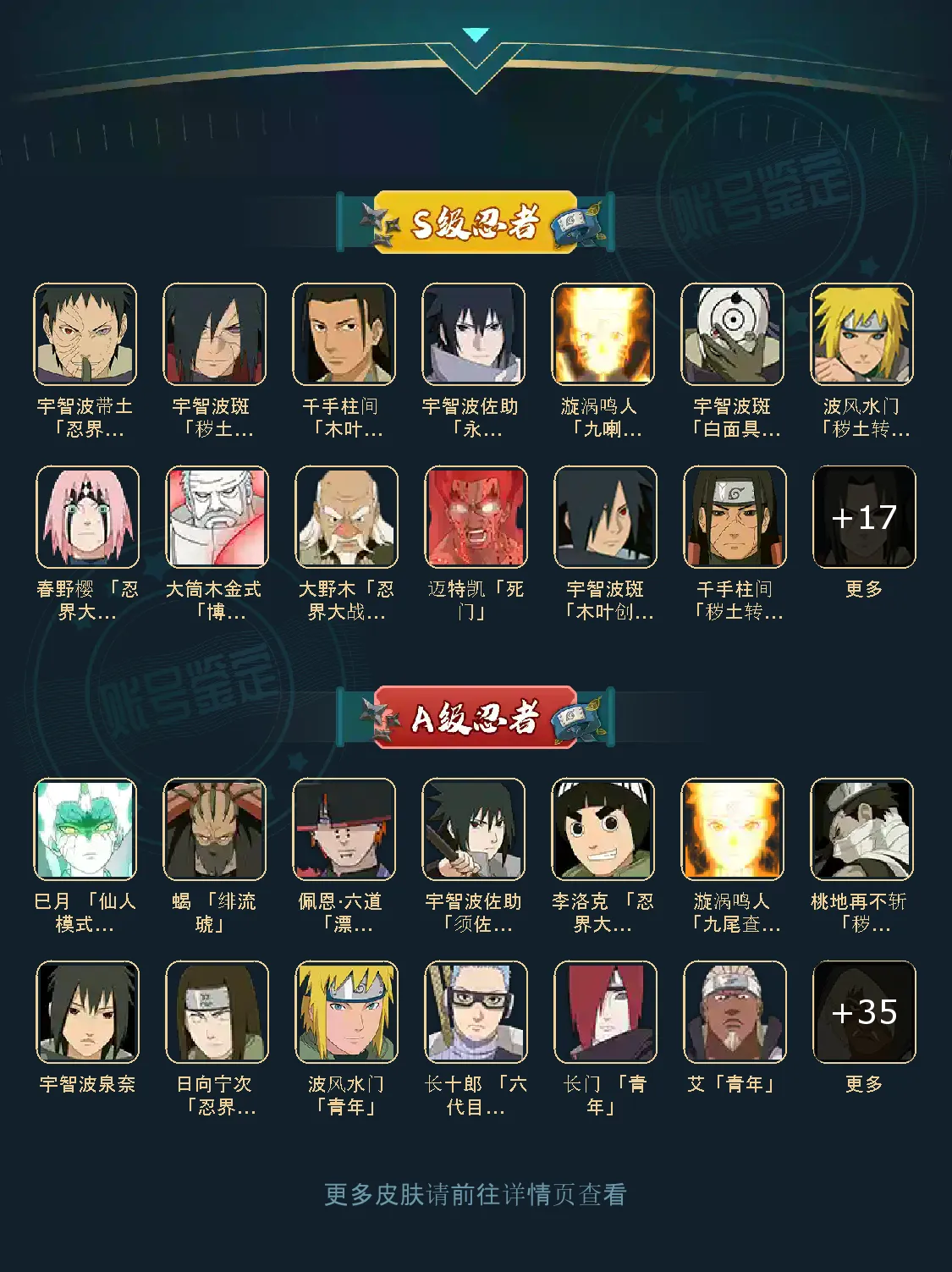 战力:1254W+;VIP11级;S忍30个;A忍39个,通灵兽20个,S忍:九喇嘛鸣人永恒万花筒佐助忍战樱豪杰自来也大蛇丸百豪纲手普通纲手死门凯波风水门秽土水门秽土猿飞秽土扉间千手柱间木叶创立柱间秽土柱间秽土斑木叶创立斑秽土鼬白面具忍战带