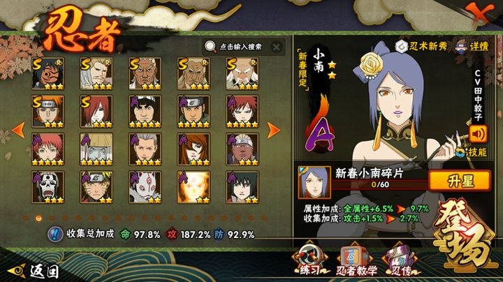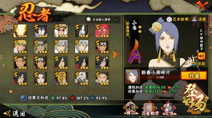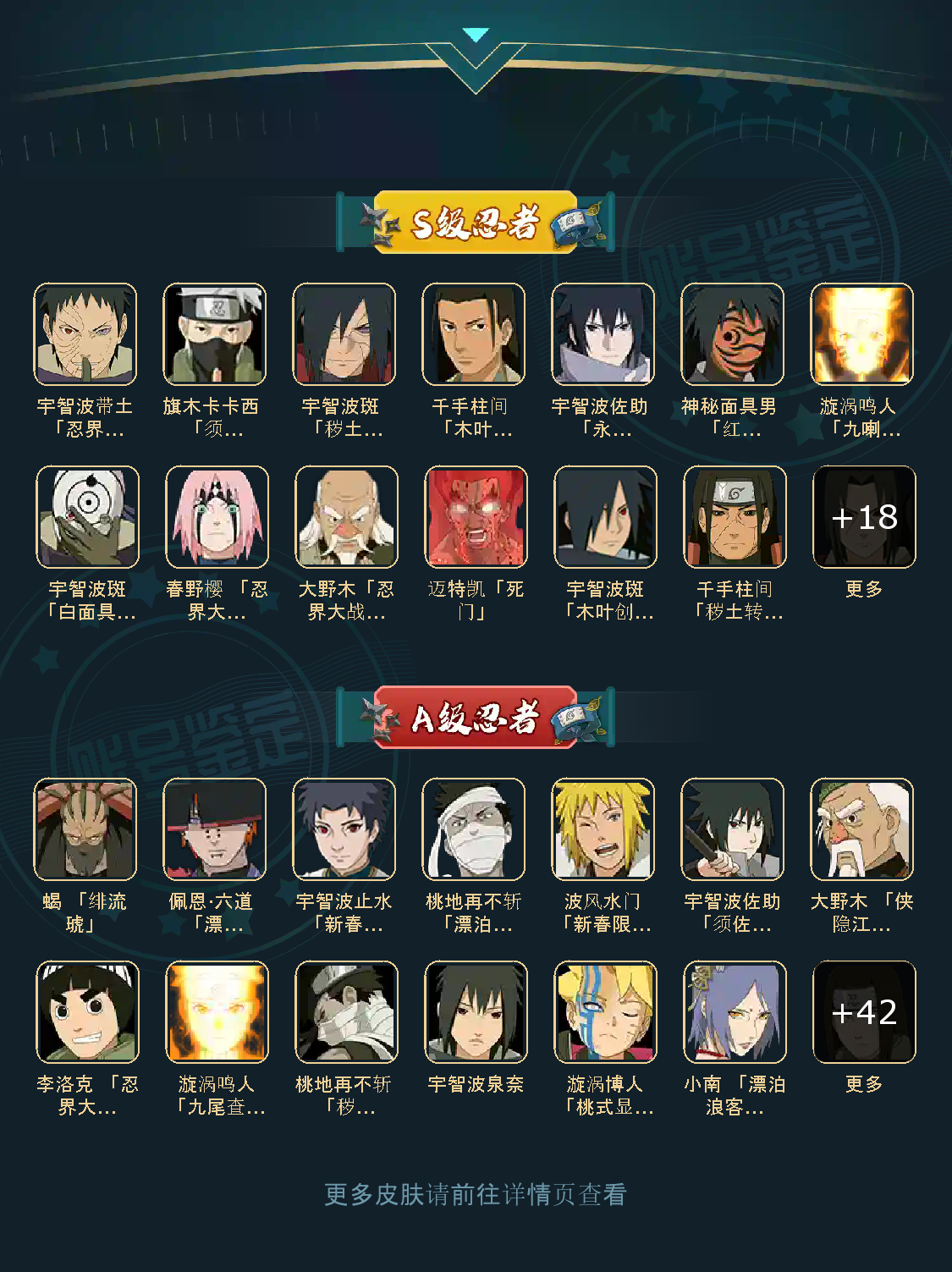 战力:1062W+;VIP14级;S忍27个;A忍48个,通灵兽18个,S忍:九喇嘛鸣人永恒万花筒佐助豪杰自来也大蛇丸死门凯波风水门秽土猿飞千手扉间秽土扉间千手柱间秽土柱间木叶创立柱间宇智波斑秽土斑木叶创立斑秽土解斑秽土鼬神秘面具男白面具忍