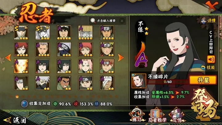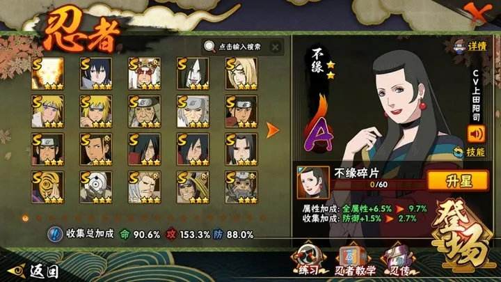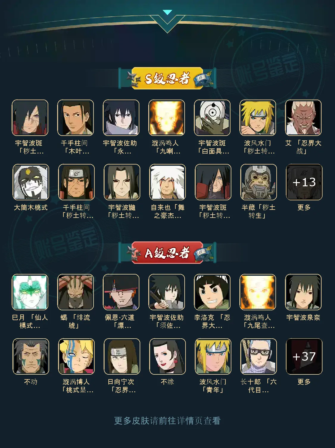 战力:1069W+;VIP14级;S忍22个;A忍42个,通灵兽17个,S忍:九喇嘛鸣人永恒万花筒佐助豪杰自来也大蛇丸百豪纲手波风水门秽土水门秽土猿飞秽土扉间千手柱间秽土柱间木叶创立柱间秽土斑秽土解斑秽土鼬神秘面具男白面具鬼灯幻月金角银角秽