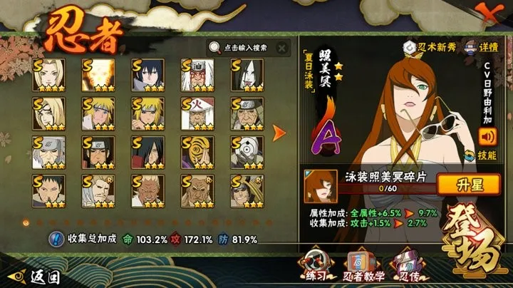 战力:1257W+;VIP14级;S忍22个;A忍45个,通灵兽20个,S忍:普通纲手九喇嘛鸣人永恒万花筒佐助仙人自来也大蛇丸百豪纲手波风水门秽土水门秽土猿飞猿飞日斩秽土扉间秽土柱间秽土斑神秘面具男白面具忍战带土鬼灯幻月忍界大战艾三代艾金角