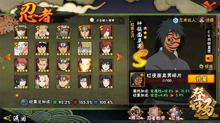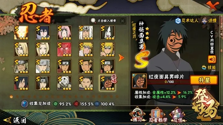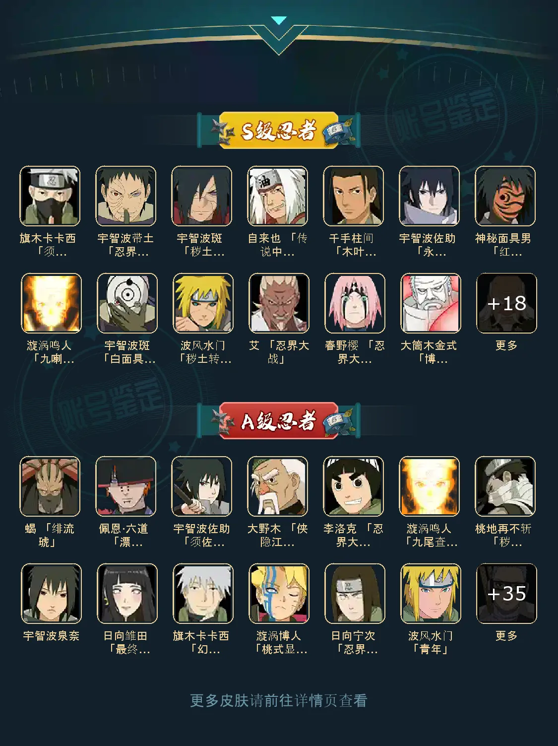 战力:1348W+;VIP10级;S忍30个;A忍39个,通灵兽18个,S忍:九喇嘛鸣人永恒万花筒佐助忍战樱普通自来也大蛇丸百豪纲手普通纲手死门凯波风水门秽土水门秽土猿飞秽土扉间千手柱间木叶创立柱间秽土柱间秽土解斑须佐鼬白面具忍战带土红夜面