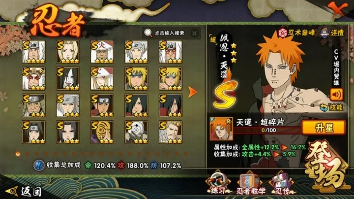 战力:1416W+;VIP12级;S忍31个;A忍37个,通灵兽20个,S忍:普通自来也普通纲手猿飞日斩千手扉间仙人自来也大蛇丸百豪纲手波风水门秽土水门豪杰自来也秽土猿飞秽土扉间千手柱间宇智波斑秽土斑须佐鼬秽土鼬神秘面具男白面具鬼灯幻月四代