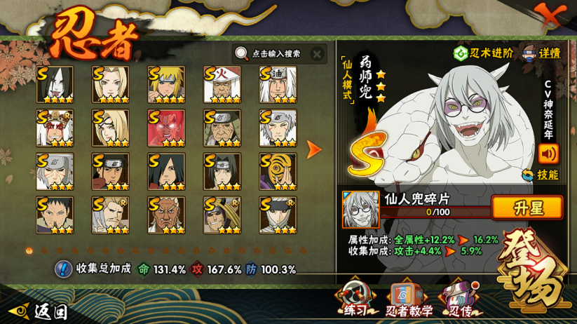 战力:1326W+;VIP14级;S忍24个;A忍46个,通灵兽20个,S忍:大蛇丸普通纲手秽土水门猿飞日斩普通自来也百豪纲手死门凯秽土猿飞豪杰自来也千手扉间秽土扉间千手柱间宇智波斑须佐鼬神秘面具男忍战带土鬼灯幻月四代艾金角银角秽土半藏二代