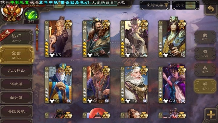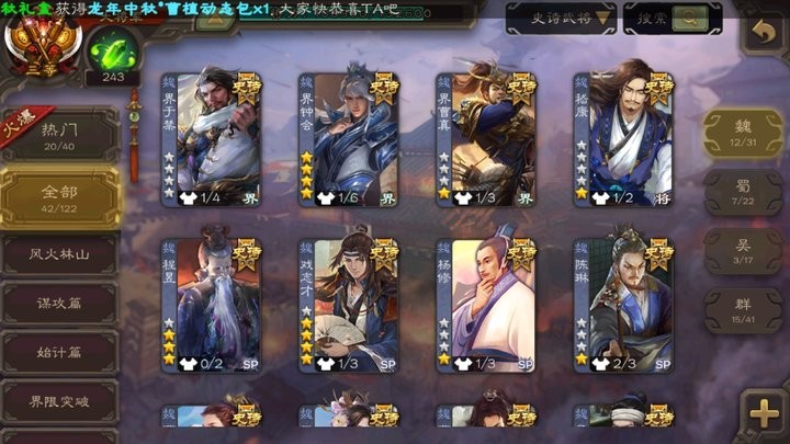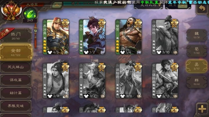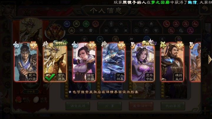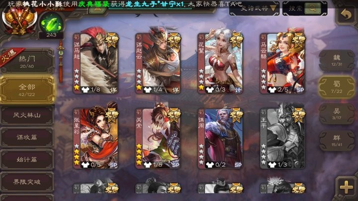 神甘宁--万人辟易,群灵雎--魂牵梦萦,蜀关羽--明良千古,魏曹婴--锋芒毕露,吴留赞--灵魂歌王,蜀关索--虎年七夕,神曹操--玄天通冥,群刘焉--雄踞益州,神赵云--战龙在野,蜀诸葛果--仙池起舞,神司马懿--鉴注知来 神周瑜,神吕蒙,神甘宁,神赵云,神司马懿,神陆逊,神张辽,神关羽 界曹仁,文钦,曹昂,界曹植,戏志才,王粲,界钟会 关索 界徐盛 刘焉 大将军】五星老刘神司马神甘5炎龙17玉龙