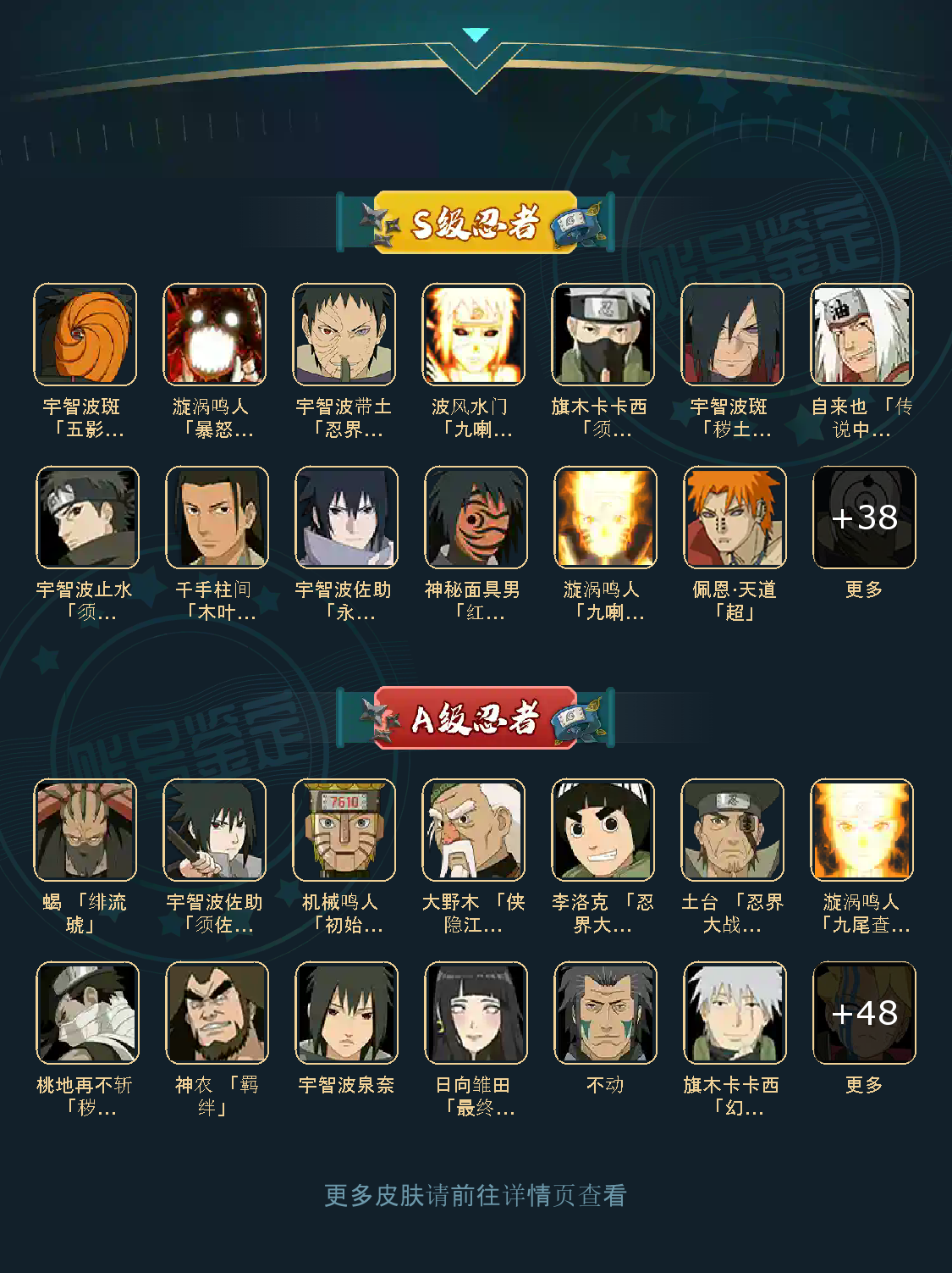 43S 48A 280忍者 神秘面具男 「红夜之刃」/宇智波斑 「秽土转生·解」/波风水门「秽土转生」/千手柱间 「木叶创立」/漩涡鸣人 「九喇嘛连结」/宇智波斑「白面具」/艾 「忍界大战」/宇智波带土「忍界大战」/宇智波佐助 「永恒万花筒」/大筒木桃式/佩恩·天道「超」
