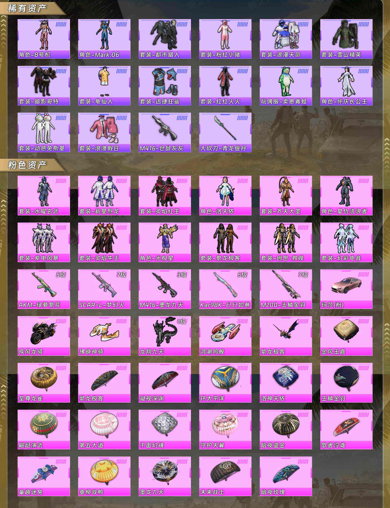 【稀有资产】角色-8号机/角色-Mark.06/套装-都市猎人/套装-粉红小猪/套装-浪漫天命/套装-雪山精英/套装-暗影哥特/套装-龟仙人/套装-迅捷狂鲨/套装-红红火火/玩偶服-卖崽青蛙/角色-怀庆长公主/套装-动感兔斯基人偶服/套装-浪漫假日/M416-仓鼠灰灰/大砍刀-青龙偃月刀