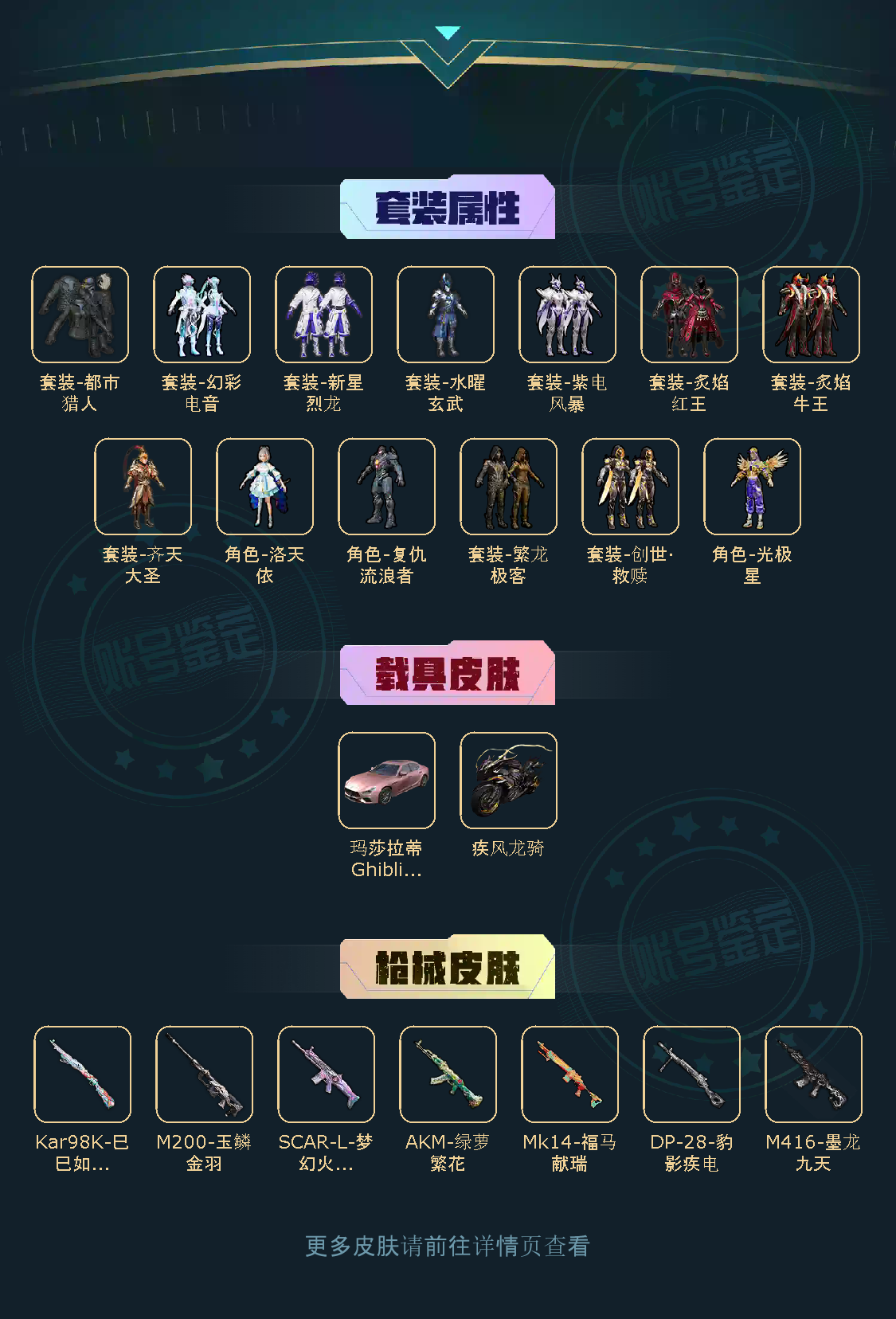【粉色套装】套装-水曜玄武/套装-新星烈龙/套装-炙焰红王/角色-洛天依/套装-齐天大圣/角色-复仇流浪者/套装-紫电风暴/套装-炙焰牛王/角色-光极星/套装-繁龙极客/套装-创世·救赎/套装-幻彩电音