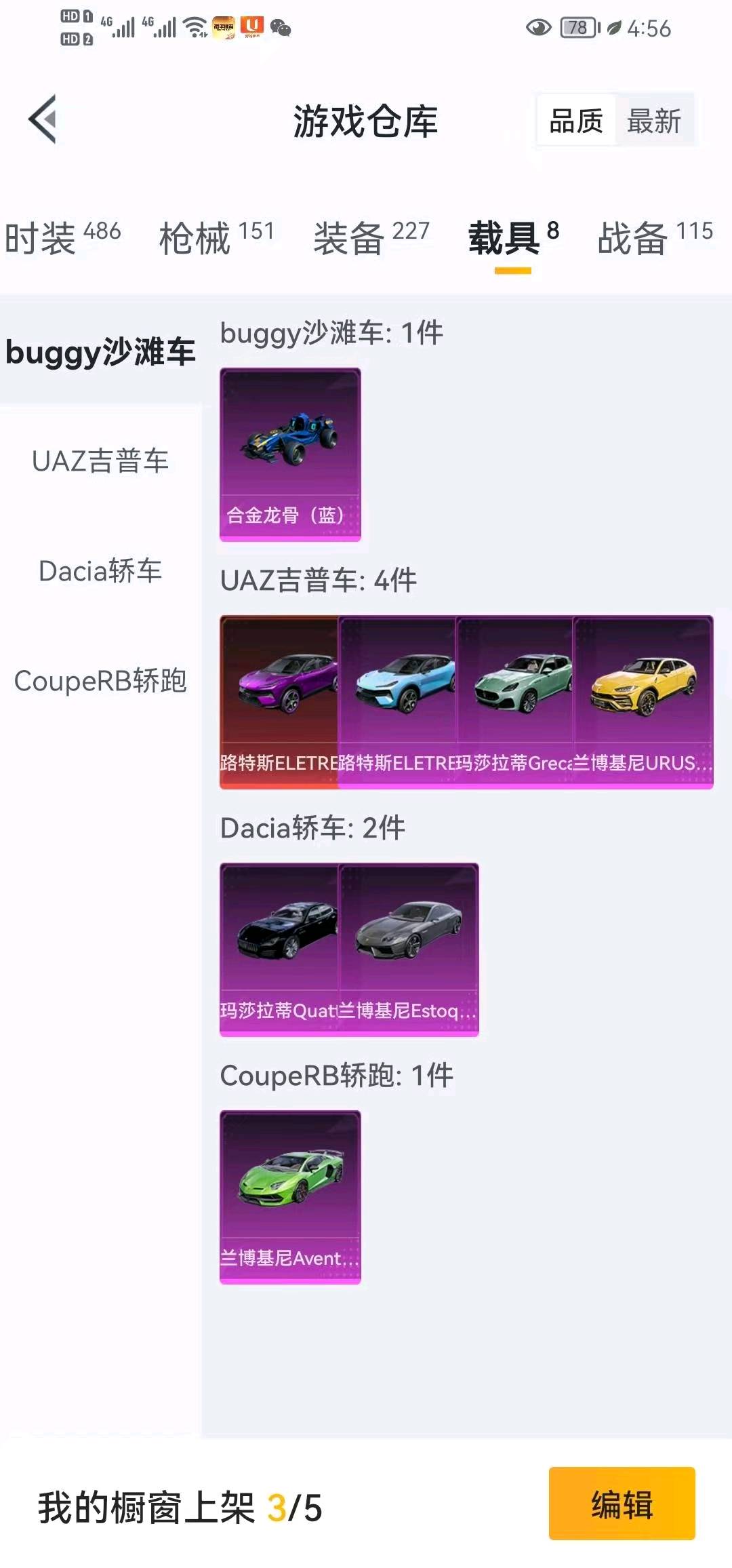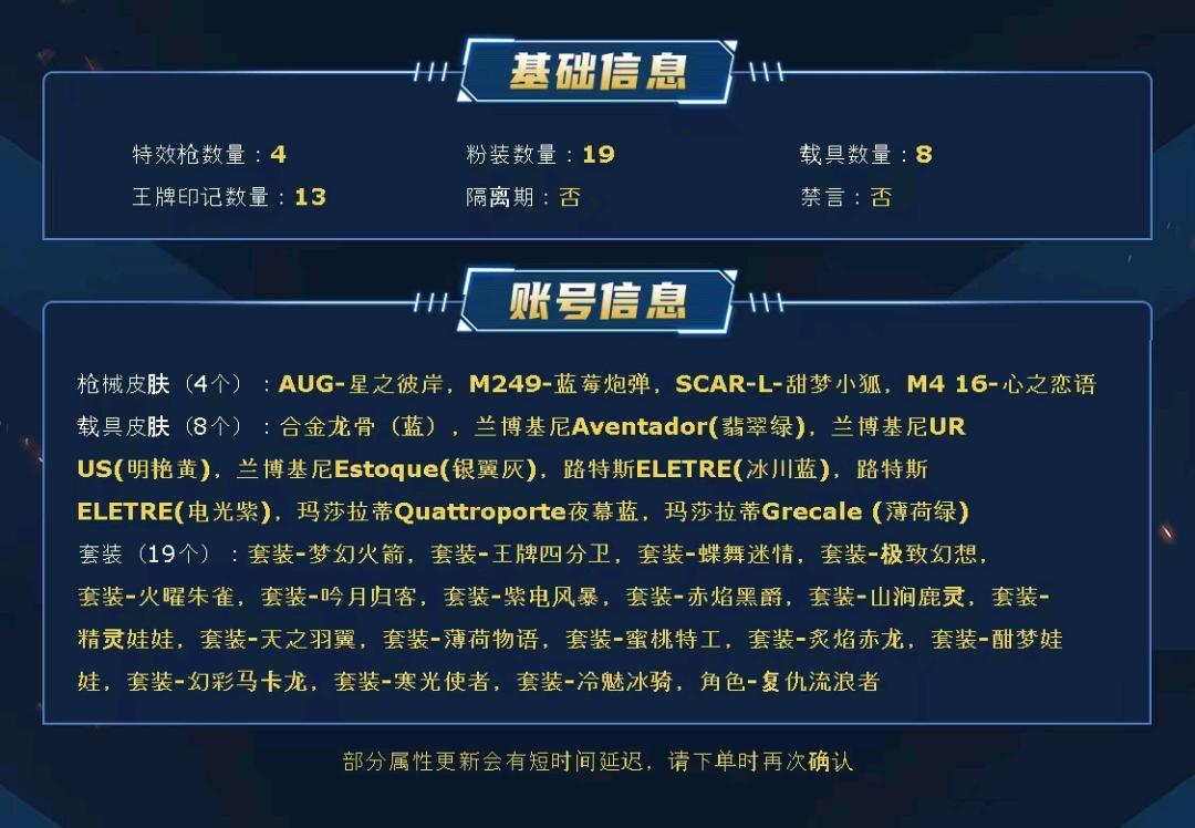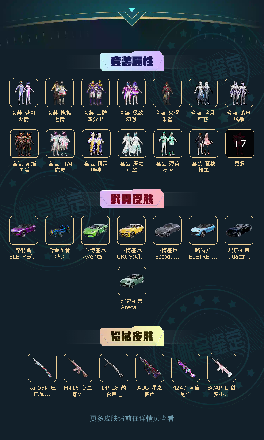 19粉,8载具,194套装,17王牌印记,超级王牌9星历史最高段,86533热力值 AUG-星之彼岸/SCAR-L-甜梦小狐/M416-心之恋语/M249-蓝莓炮弹/DP-28-豹影疾电/Kar98K-巳巳如意/兰博基尼Estoque(银翼灰)/玛莎拉蒂Quattroporte夜幕蓝/路特斯ELETRE(冰川蓝)/兰博基尼URUS(明艳黄)/路特斯ELETRE(电光紫)/玛莎拉蒂Grecale(薄荷绿)/合金龙骨(蓝)/兰博基尼Aventador(翡翠绿)/