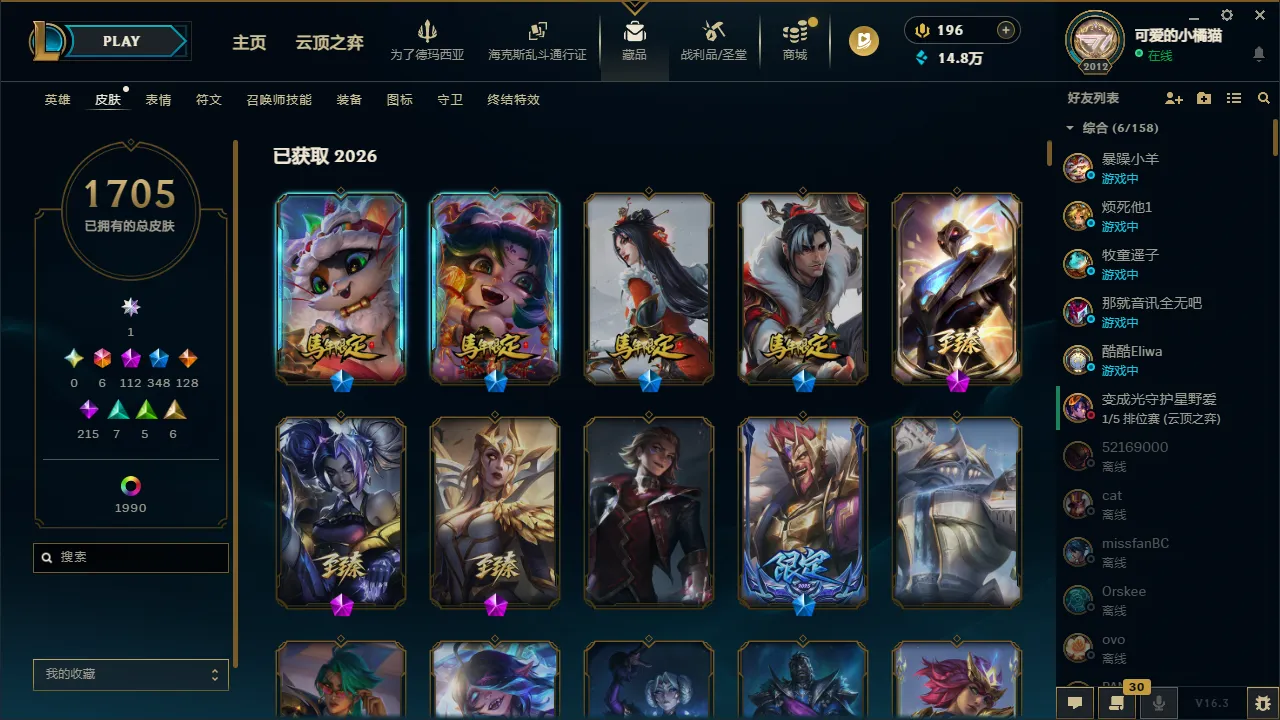 █海克斯满级█允许排位█3734皮█艾欧尼亚█93臻彩█踏雪寻梅█马年限定█龙虾琴刀█手办猫猫头像█