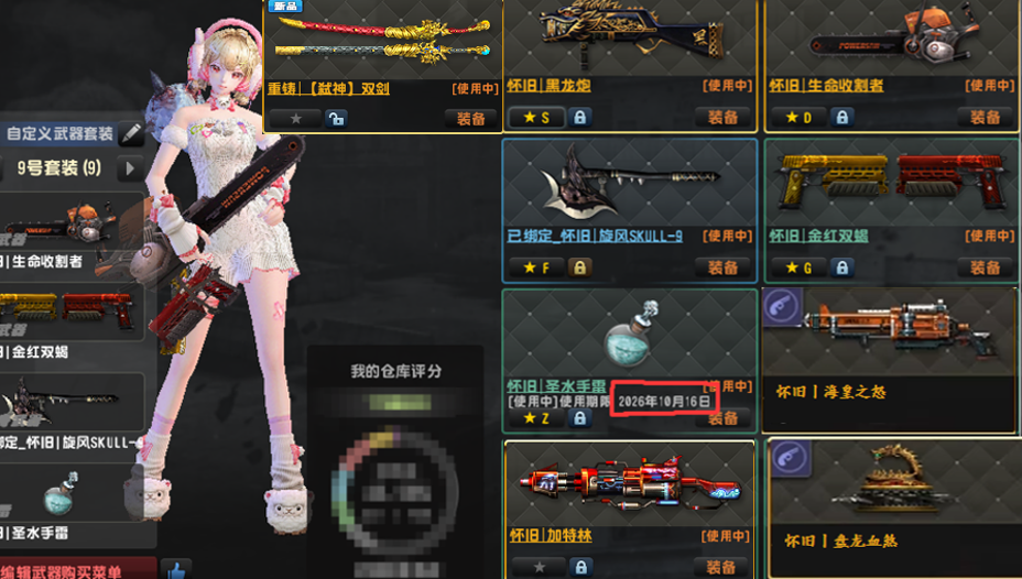 3. 更新:怀旧弑神,怀旧三件套金红双蝎黑龙炮斧头!特典加特林黯火和特典狙暗影,光束全套123,闪电套野牛和94,生化Z全部赛季都有!赛季有第1,第6到21赛季(重要赛季全有,第1,6,7,9,10,12,14,16,17,18,21等)!满配件满强化,全66配件,完美强化!其他武器看图,已去黑雾!