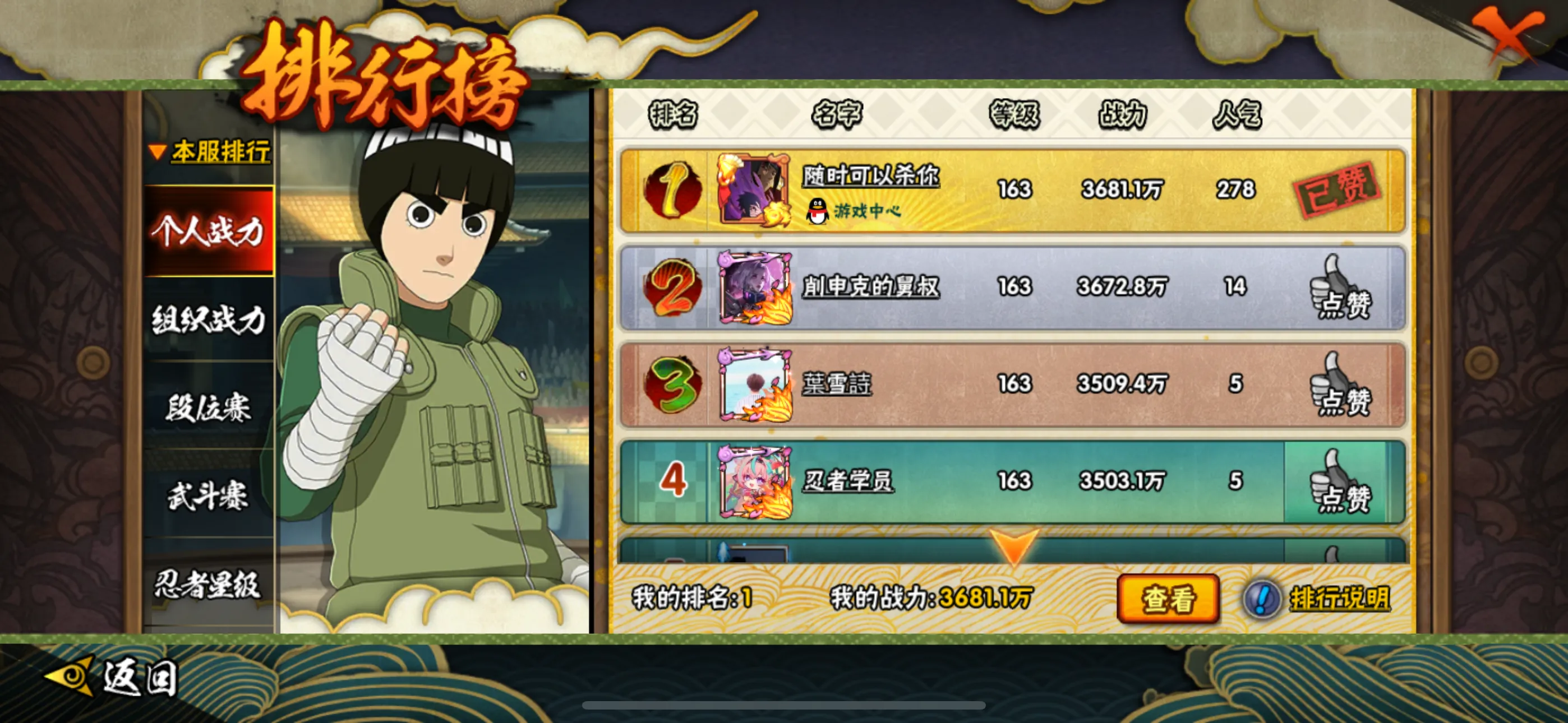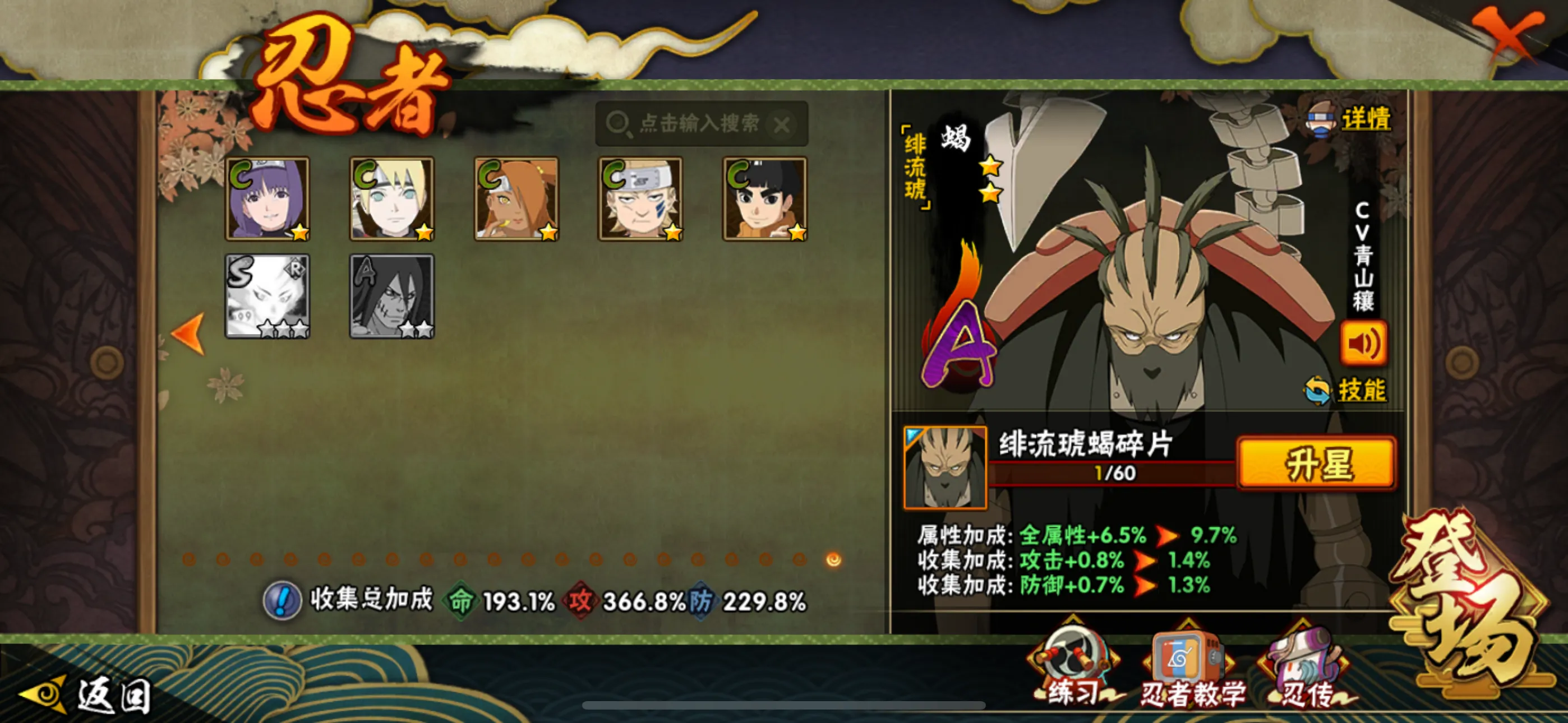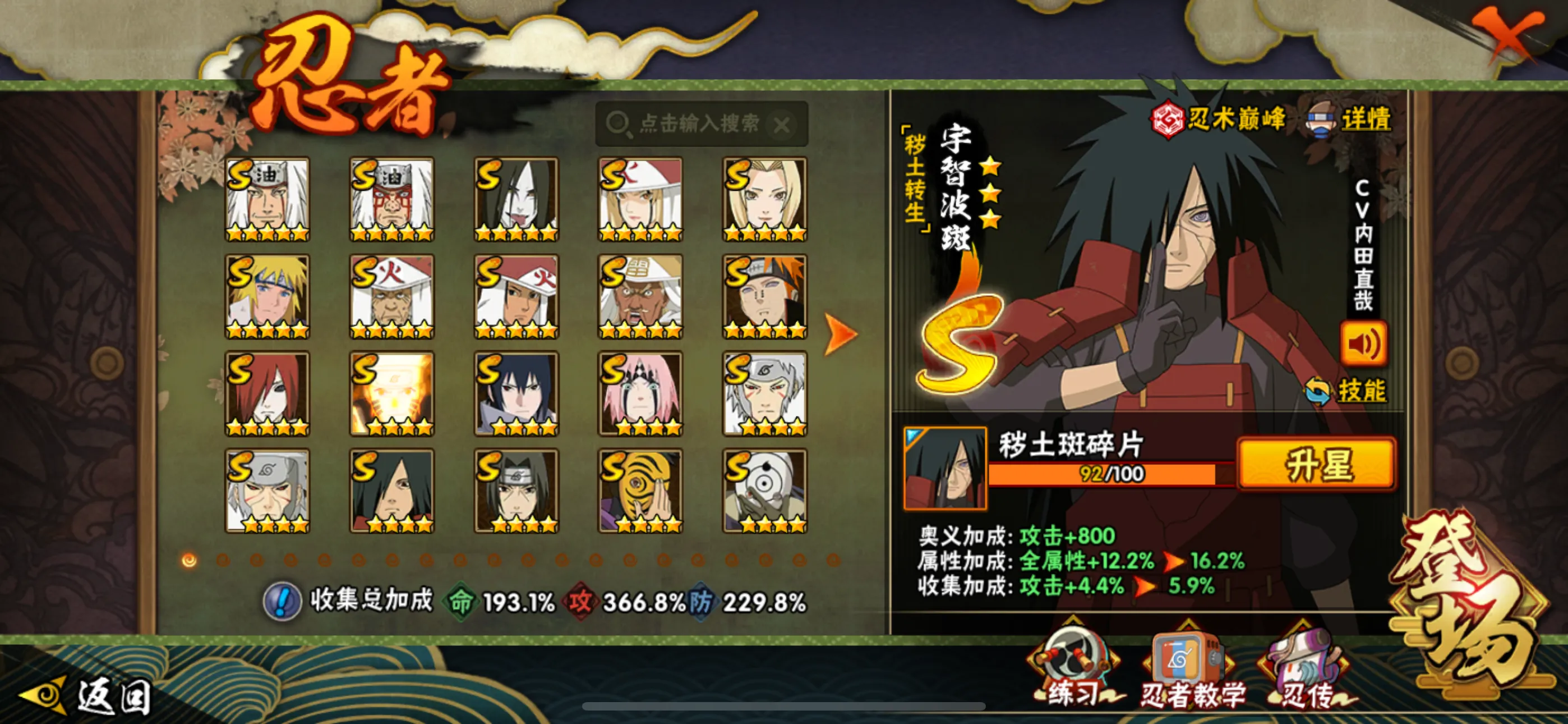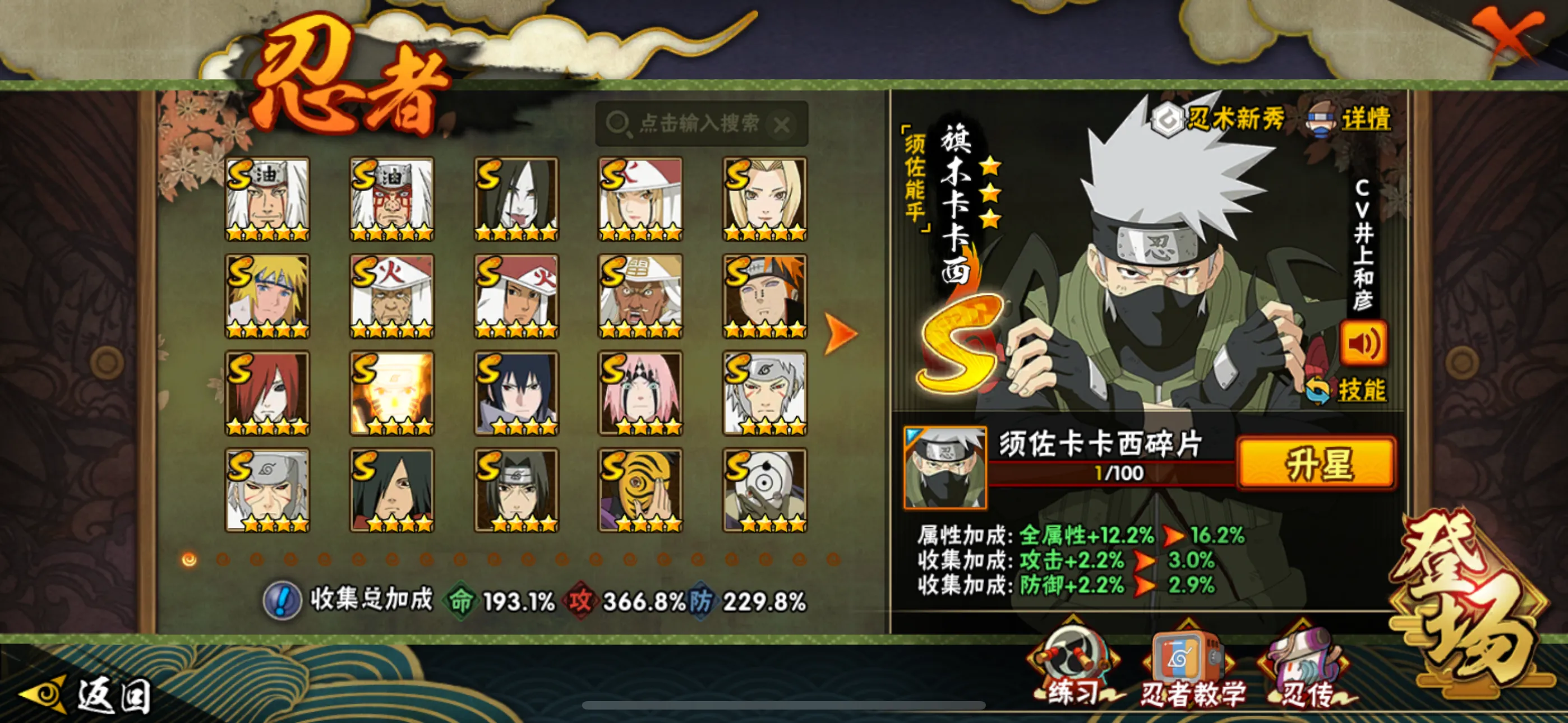 S级忍者(52个):,波风水门「九喇嘛连结」,自来也,舍人,旗木卡卡西「须佐能乎」,宇智波止水「须佐能乎」,艾「忍界大战」.大筒木桃式,宇智波斑「秽土转生•解」,千手柱间「木叶创立」,宇智波佐助「永恒万花筒」,神秘面具男「红夜之刃」,春野樱「忍界大战」,大简木金式「博人传」,流涡鸣人「九喇嘛连结」,三代目风影「秽士转生」,大野木「忍界大战」,迈特凯「死门」,宇智波斑「木叶创立」,宇智波带士「忍界大战」,千手柱间「秽士转生」,罗砂「四代目风影」,宇智波鼬「秽士转生」,自来也「舞之豪杰」,佩恩•天道「超」,药师兜「仙人模式」,宇智波斑「秽士转生」,艾「三代目雷影」,宇智波斑「白面具」,半藏「秽士转生」,千手扉间「秽士转生」,纲手「百豪」,无「二代目士影」,波风水门『秽士转生」,金角•银角「秽士转生」,猿飞日斩「秽土转生」,长门「秽士转生」,宇智波斑,千手柱间,艾「四代目雷影」,千手扉间,神秘面具男,鬼灯幻月「二代目水影」,佩恩「天道」,大蛇丸,波风水门,纲手,自来也,宇智波鼬「须佐能乎」,大野木「三代目士影」,自来也「仙人模式」,猿飞日斩