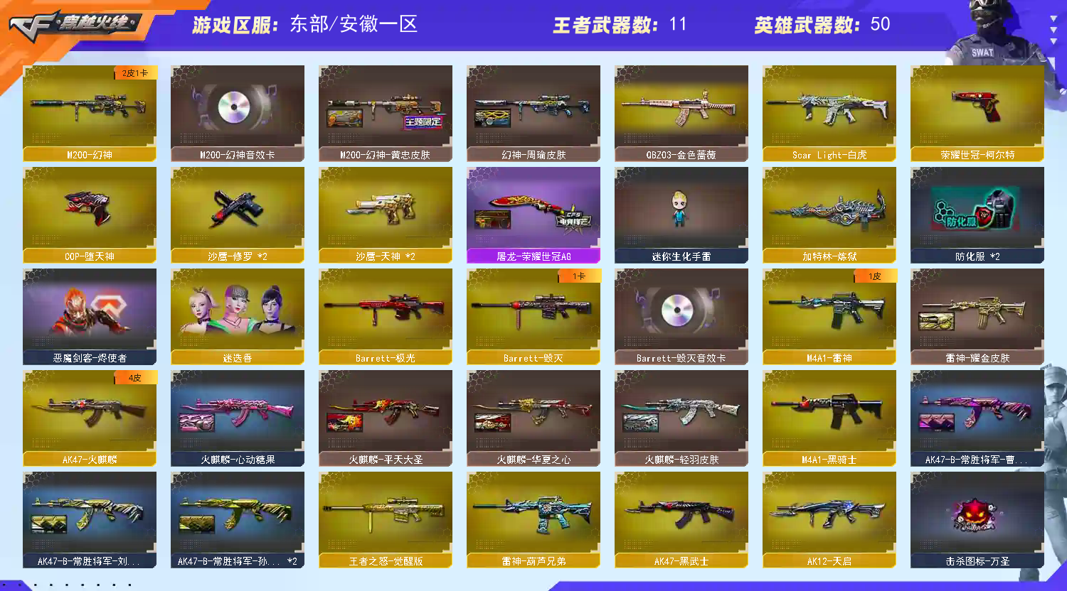 Lv.102荣耀元帅,11王者/2炫金/48英雄/CF点527/【重要角色2】角色-迷迭香/铁骑荣耀【王者武器11】王者之怒-觉醒版/雷霆王者之锋-觉醒版/王者之击-觉醒版/闪光弹-雷霆王者-觉醒版*2/烟雾弹-雷霆王者-觉醒版/高爆手雷-雷霆王者*3/闪光弹-雷霆王者/烟雾弹-雷霆王者【炫金武器2】炫金火麒麟/炫金骑士【热门武器9】M200-幻神/死亡之眼/荣耀世冠-柯尔特/白虎/2修罗/炼狱/暗杀者-街机/黑骑士-摸金校尉【英雄武器50】超新星-热带奇洋/黑武士-锦绣游龙/AK47-火麒麟/AK12-天启/M4A1-黑骑士/雷神-葫芦兄弟/AK47-黑武士/AK-47-猩红传说/M4A1-雷神/AK47-B-常胜将军/AK47-B-战士/AK47-B-身先士卒/ScarLight-白虎/QBZ03-金色蔷薇/Barrett-极光/Barrett-毁灭/M200-幻神/Barrett-暗月传说*2/加特林-炼狱/龙啸-热带奇洋/龙啸/屠龙*3/龙啸-堕天神/麒麟刺-堕天神/手雷-热带奇洋/烟雾弹-云龙/烟雾弹-堕天神*5/高爆手雷-堕天神*5/闪光弹-堕天神*5/荣耀世冠-柯尔特/沙鹰-修罗*2/COP-堕天神/沙鹰-天神*2【热门皮肤12】雷神耀金/火麒麟-轻羽/屠龙-荣耀世冠AG/火麒麟-华夏之心/幻神-周瑜/M200-幻神-黄忠/火麒麟-平天大圣/火麒麟-心动糖果/火麒麟-CFSTAR/修罗-CFSTAR*2/天龙-CFSTAR【人偶武器5】火麒麟-灵狐/巴雷特-零-水下丽影/迷你生化手雷/灵狐娃娃手雷/AWM-灵狐-15周年嘉年华【暴走生化武器1】死亡之眼【挑战武器5】ScarLight-白虎/M4A1-黑骑士/神圣爆裂者-末日III*2/AK47-冰龙粉碎者【音效卡武器3】ScarLight-白虎-热带奇洋音效卡/M200-幻神音效卡/Barrett-毁灭音效卡【普通皮肤5】AK47-B-常胜将军-刘备/AK47-B-常胜将军-孙权*2/AK47-B-常胜将军-曹操/战神-粉色甜心【光效8】巴雷特-毁灭蓝色光效/M4A1-雷神紫橙光效/雷霆王者之锋光效/龙啸蓝粉色光效/沙鹰-修罗蓝色光效/王者之击金色光效/王者之翼金色光效/AK47-黑武士蓝色光效【玩偶18】15周年玩偶/三国-吴国玩偶/三国-吴国玩偶/夏日玩偶/胡司令玩偶/裂空之翼红色玩偶/关羽玩偶/大乔玩偶/火麒麟玩偶/妖姬玩偶/大乔玩偶/大乔玩偶/三国-蜀国玩偶/三国-魏国玩偶/三国-魏国玩偶/三国-魏国玩偶/三国-蜀国玩偶/葫芦兄弟-水娃玩偶【戒指武器12】29赛季纪念戒指-耀金(拇指)/8周年戒2/25赛季纪念戒指-耀铜(拇指)/15周年限定戒指/24赛季纪念戒指-耀银(拇指)/24赛季纪念戒指-耀银(食指)/23赛季纪念戒指-耀银(拇指)/22赛季纪念戒指-耀银(拇指)/21赛季纪念戒指-耀银(拇指)/21赛季纪念戒指-耀银(食指)/20赛季纪念戒指-耀金/18赛季纪念戒指-耀银