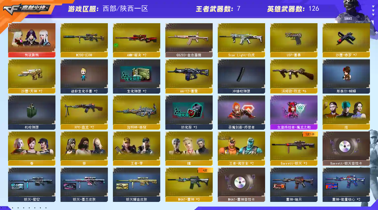 武器:幻神 斯泰尔-蝴蝶,6烈龙,2盘龙,加特林-炼狱,M4A1-青龙,HK417-朱雀,Barrett-朱雀,白虎,裁决,MAC-10-途鸦 3轻型军用手斧-镜 2迷你生化手雷