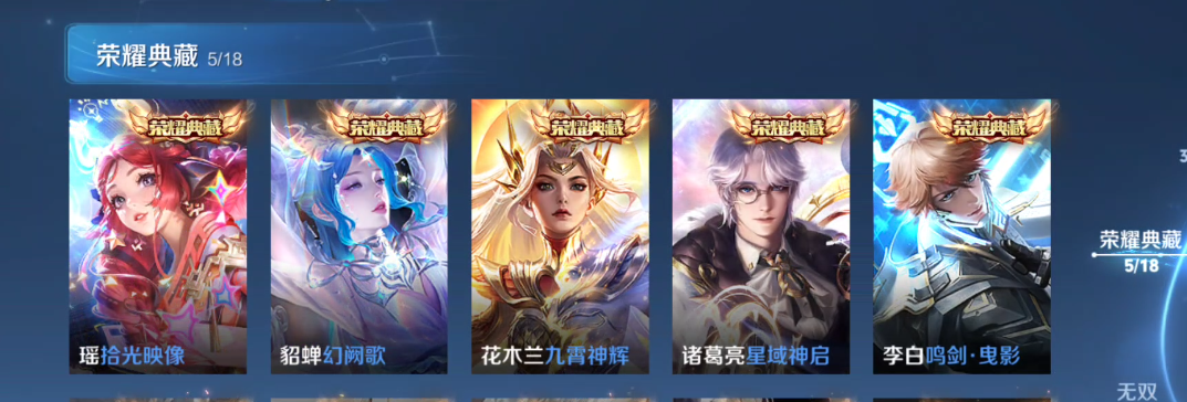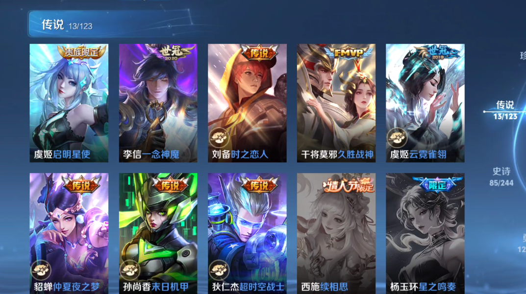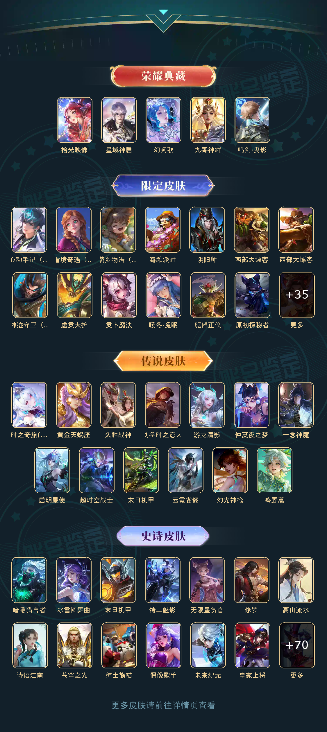 贵族等级V8,英雄数量122,典藏皮肤数5,皮肤数量321,久胜战神/鸣剑·曳影/星域神启