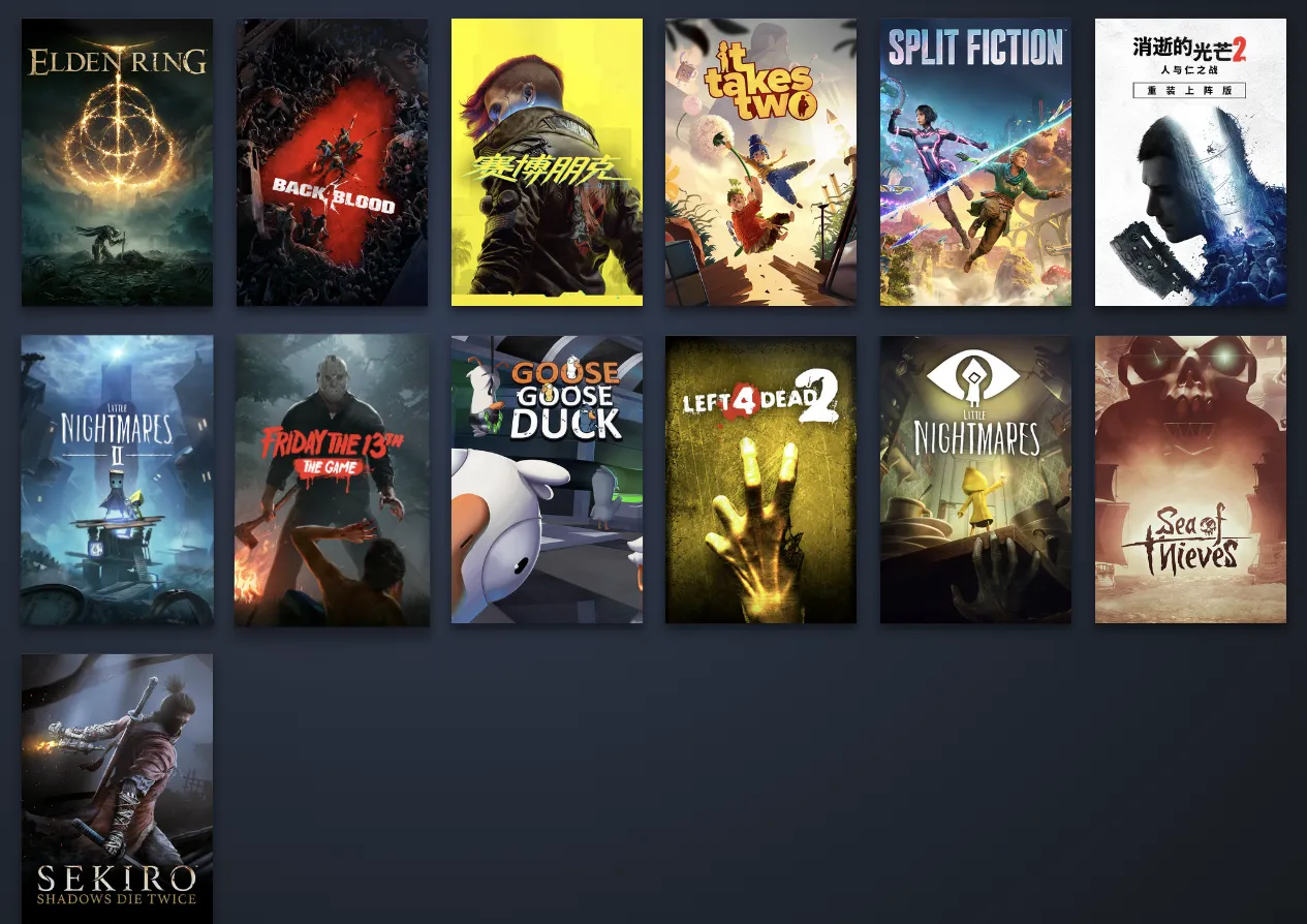 双影奇境、双人成行、大富翁11、胡闹厨房2、REPO、PEAK、泡姆泡姆、艾尔登法环/老登环、消逝的光芒2人与仁之战(Dying Light 2 Stay Human)、盗贼之海 (Sea of Thieves)、赛博朋克2077 Cyberpunk 2077)、小小梦魇2 (Little Nightmares II)、小小梦魇1/小小噩梦 (Little Nightmares)、13号星期五 (Friday the 13th: The Game)、只狼影逝二度 (Sekiro: Shadows Die Twice)、求生之路2、喋血复仇